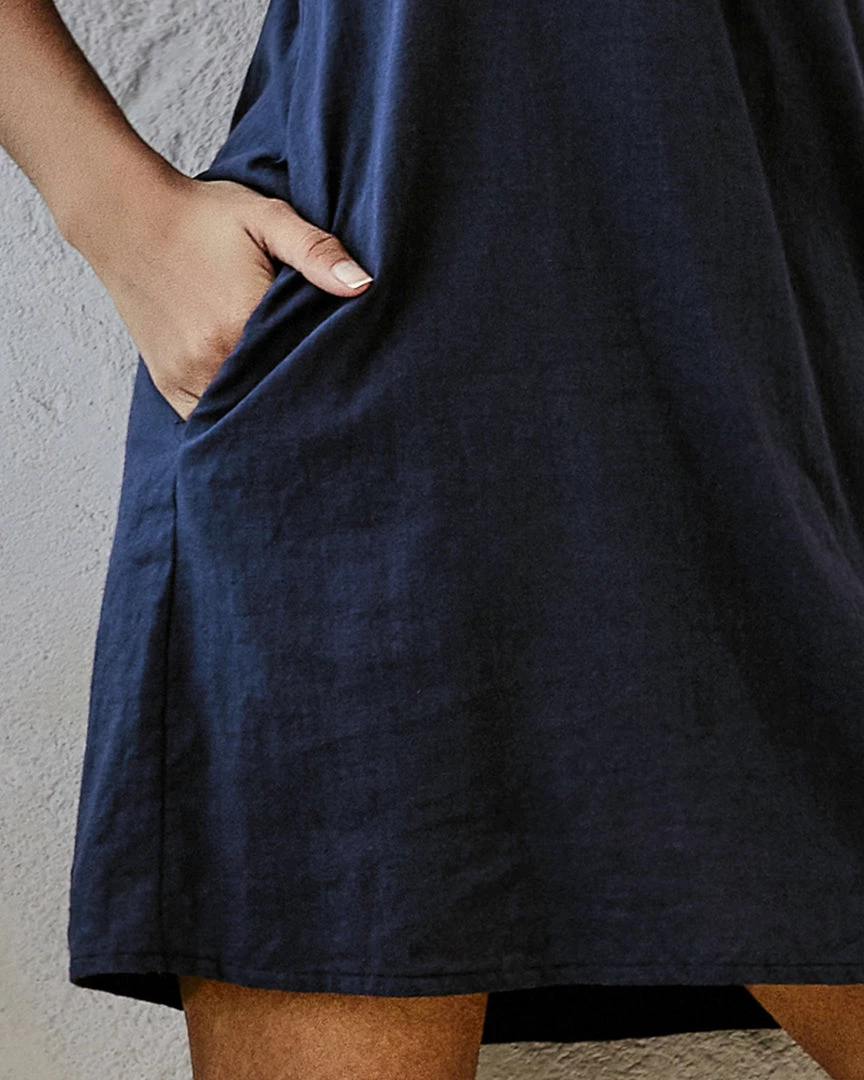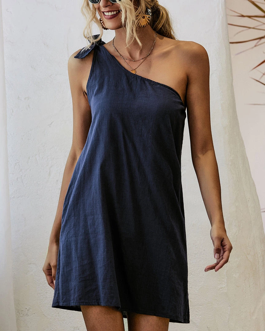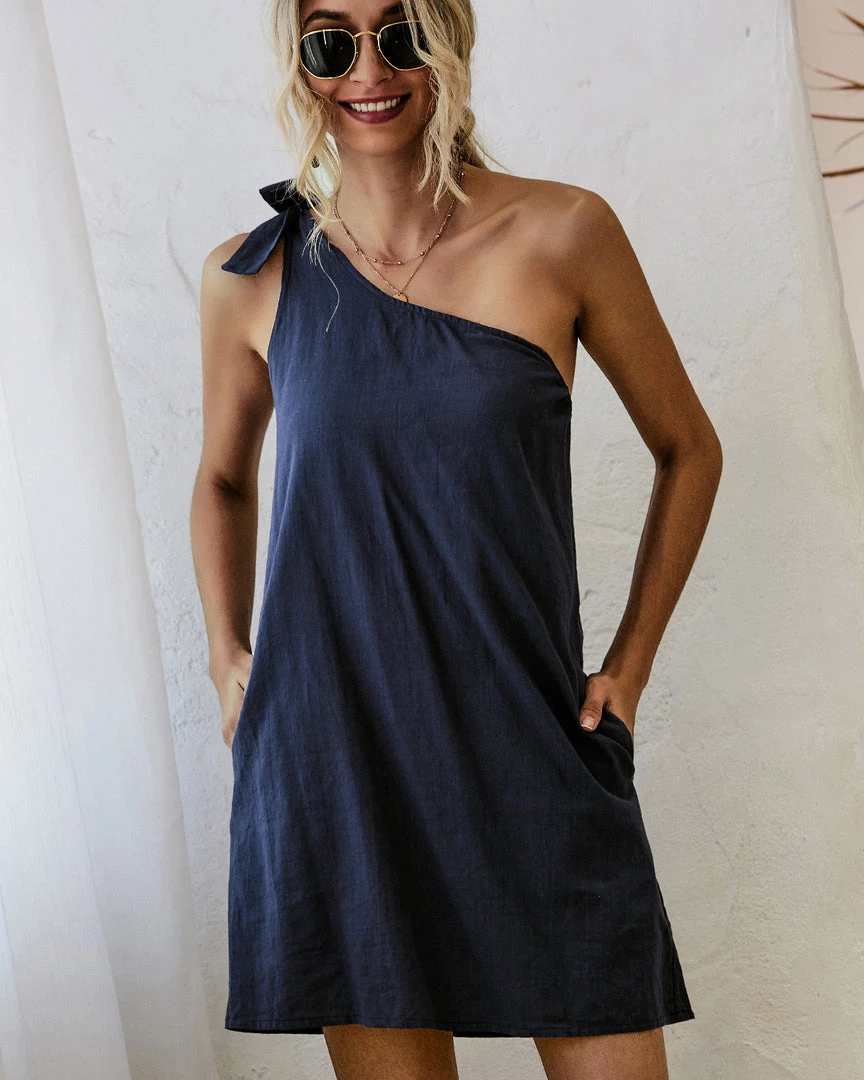 Tied at one shoulder, this curve-skimming dress flaunts bold modern vibes, and the pockets provide a convenient detail.