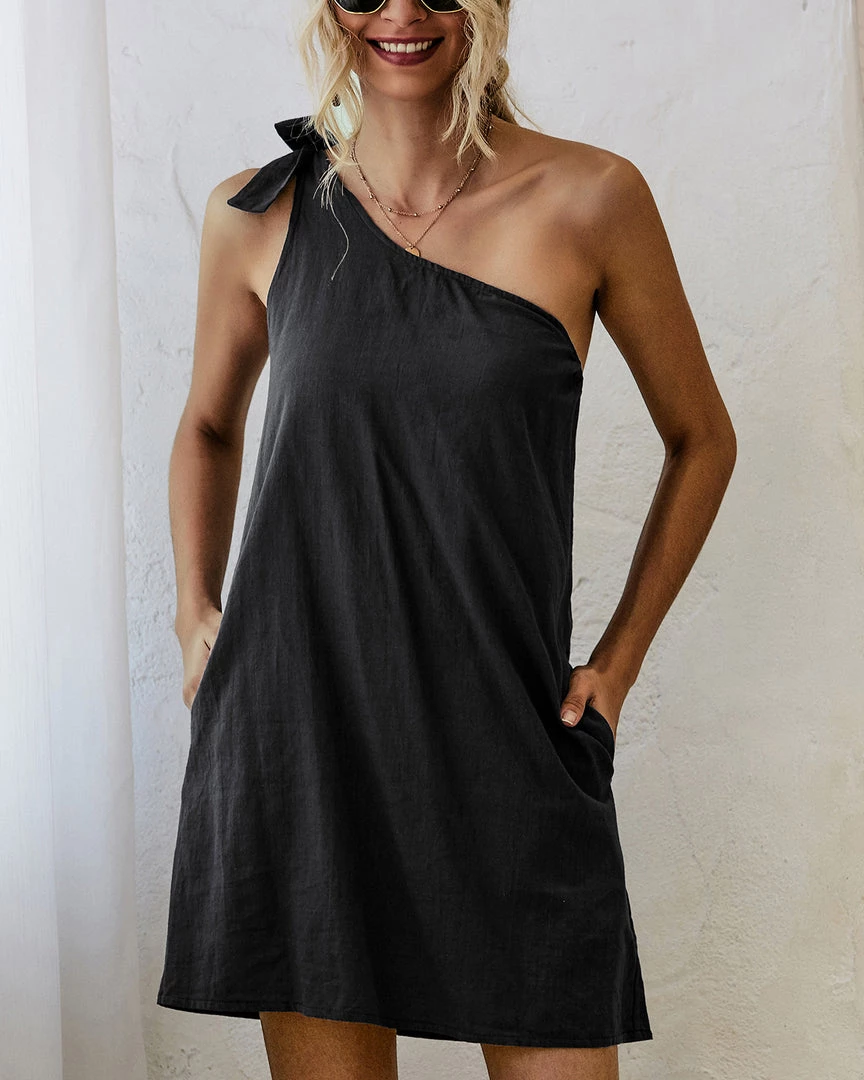 Tied at one shoulder, this curve-skimming dress flaunts bold modern vibes, and the pockets provide a convenient detail.