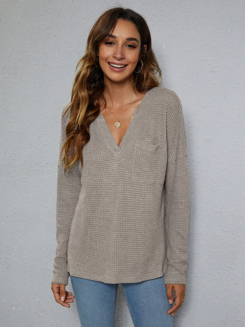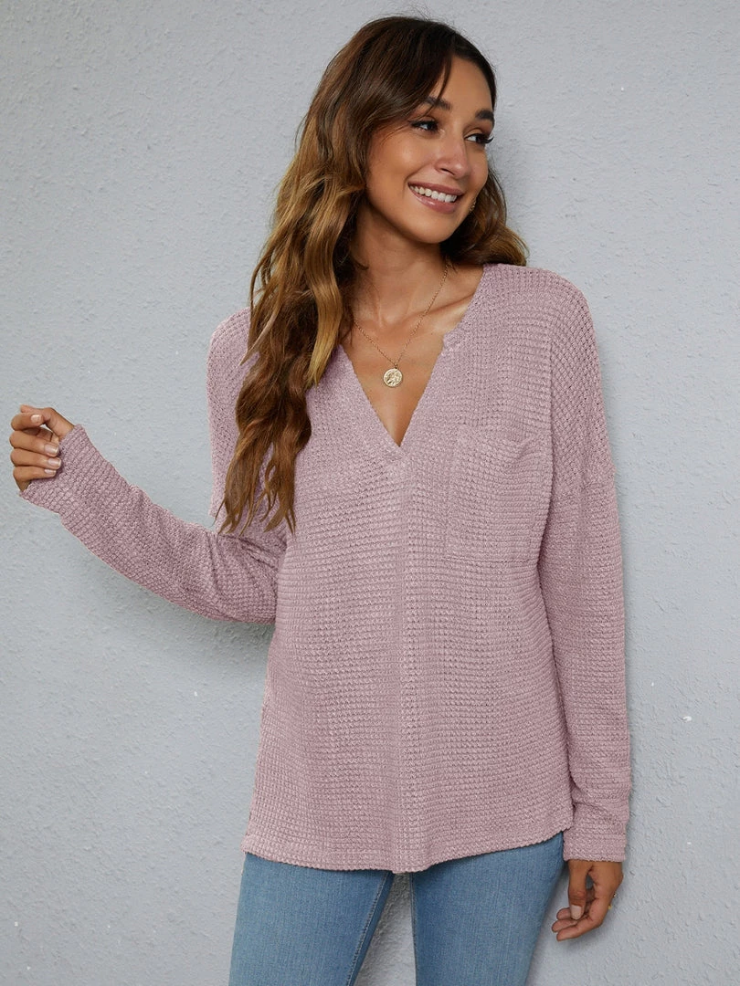 Refresh your coming cool-weather collection with this cozy sweater that flaunts a flowy silhouette with a flattering V-neckline and chest pocket.