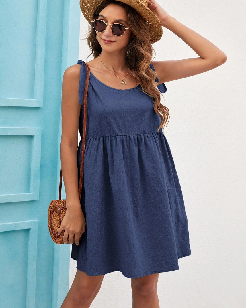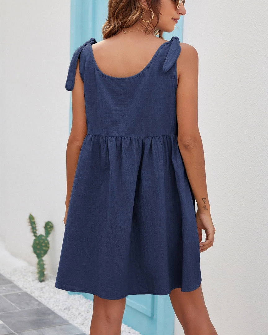 BBYS Tie-Bow Strap Side Pocket Linen Shift Dress – Navy New In Clothing