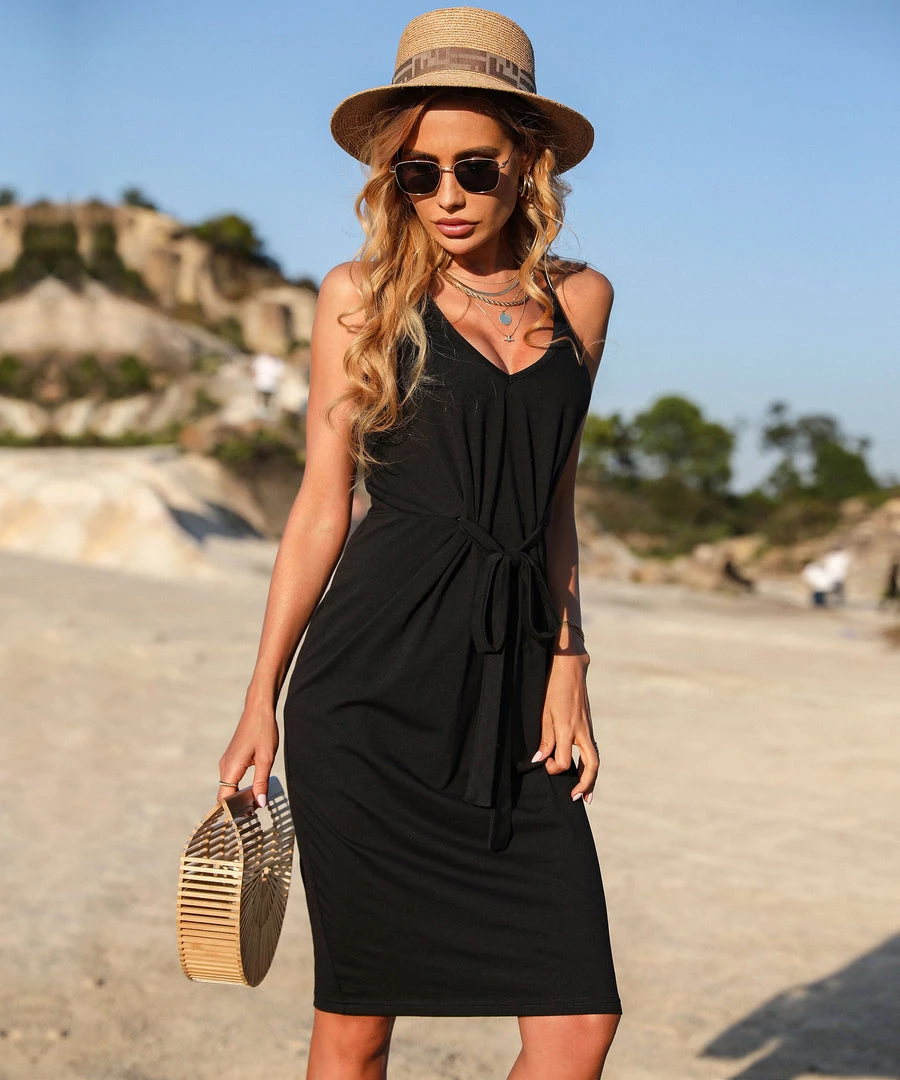 Our Adkins Dress comes in solid black tone. This mini features a low neckline with a waist belt, sleeveless and singlet style. This pairs beautifully with our sandals and heels for the perfect off-duty look.