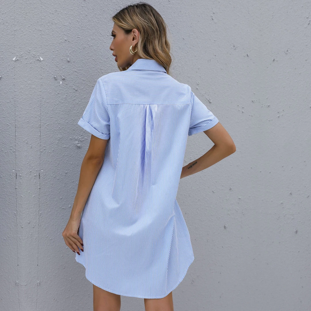 - Feature: Mini length. Relaxed fit. V neckline. Traditional collar. Short sleeves.
