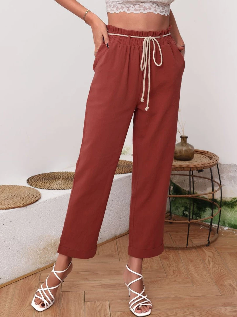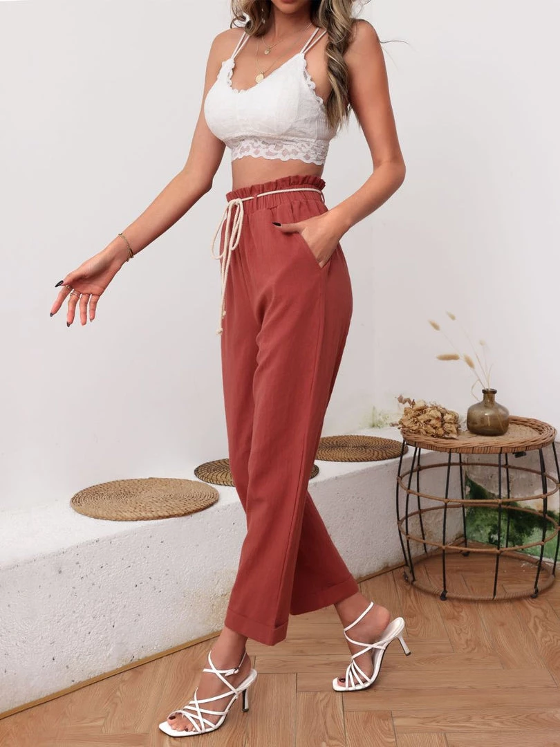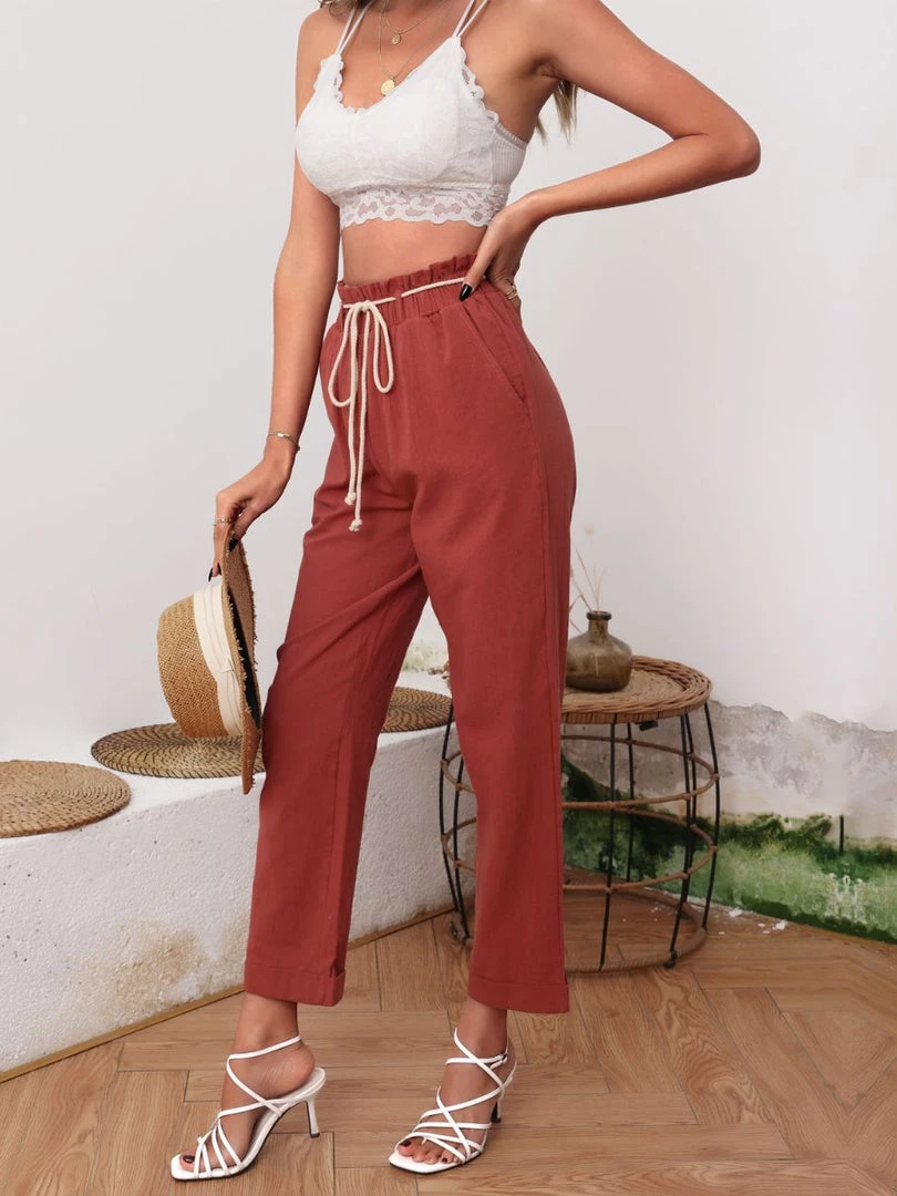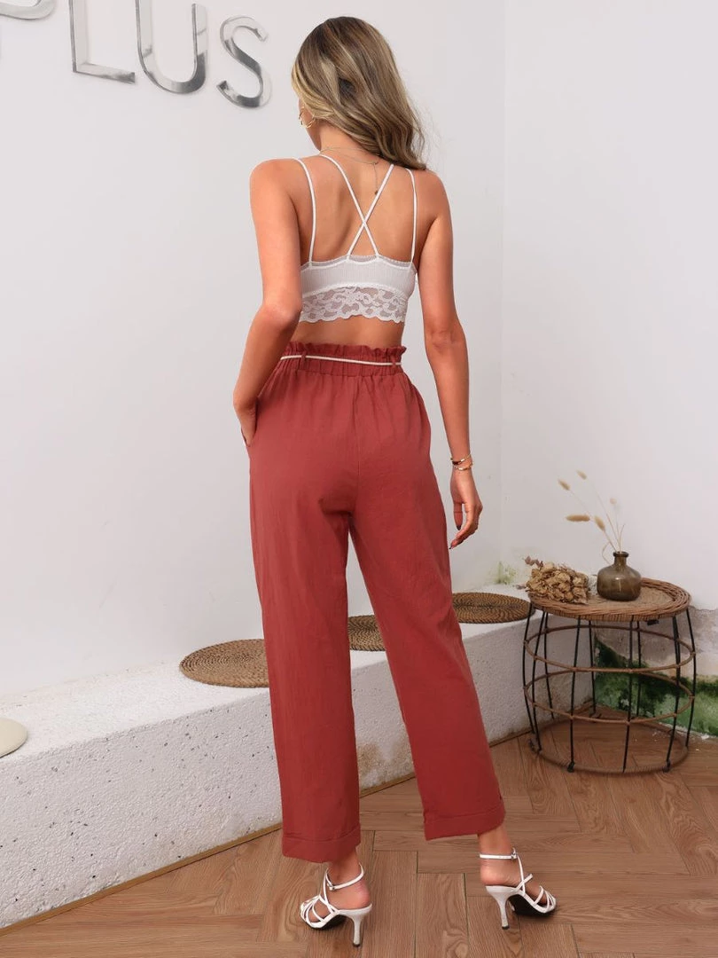 Our Alma Pants are a rust tone in a relaxed fit. These corporate-style pants feature a fitted high waist, wide-leg design, and side pockets for ultimate style and functionality. The detachable fabric waist belt is the perfect touch to this number.