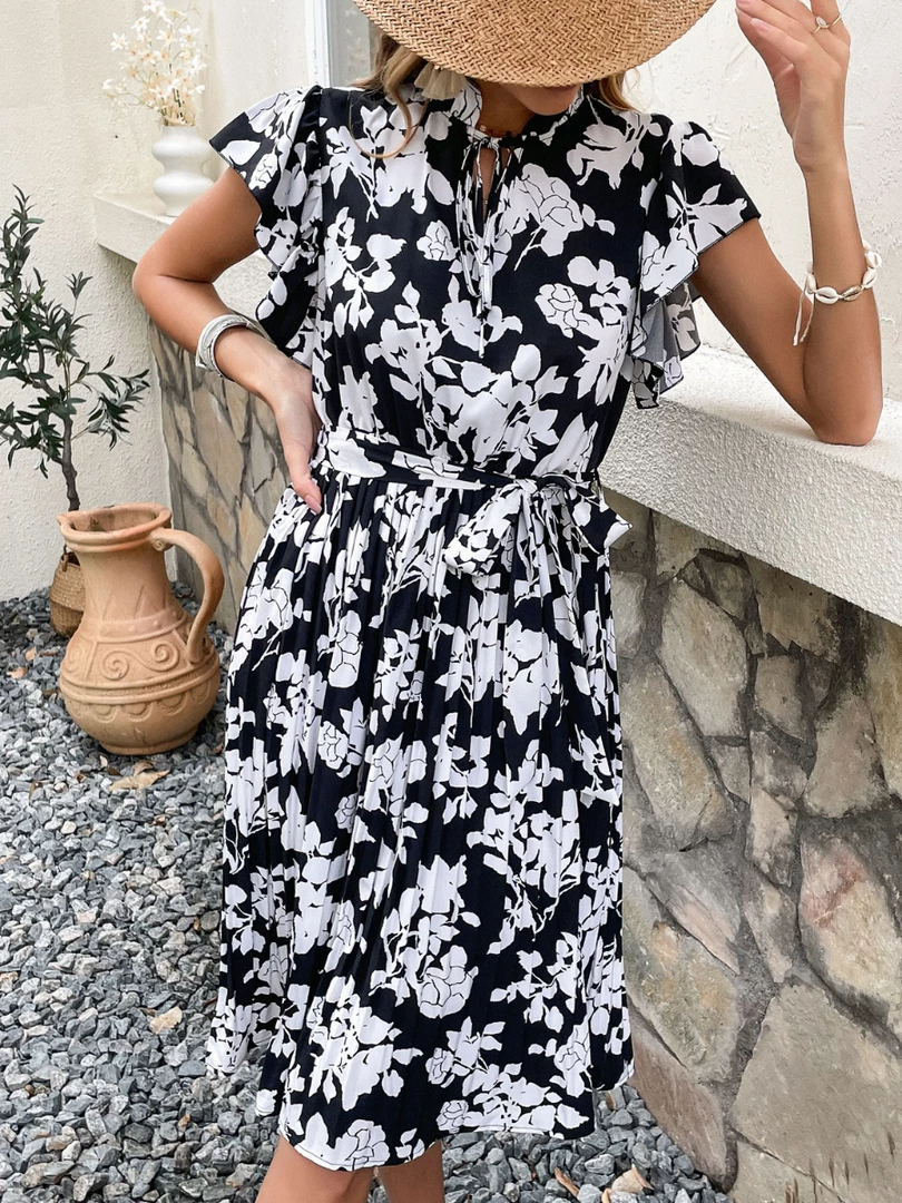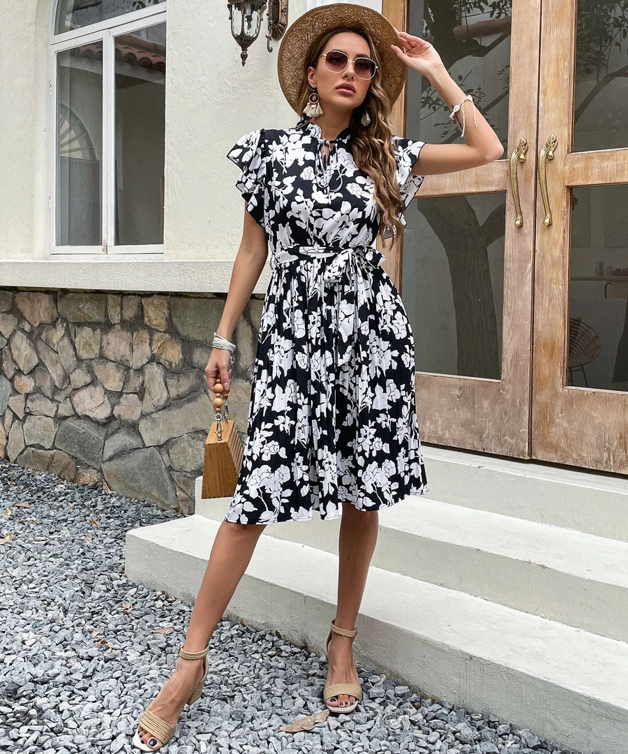 Our Almira Dress comes in a black tone base, with contrasting white tone print. It features a high neckline, short ruffle sleeves and a fabric waist tie to cinch in the figure beautifully. This midi pairs beautifully with our luxe heels for a stunning casual look!!