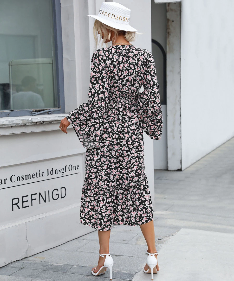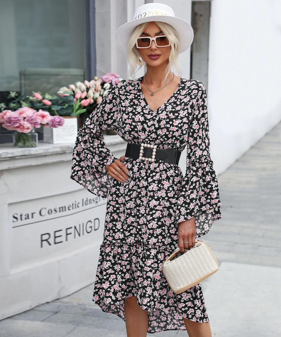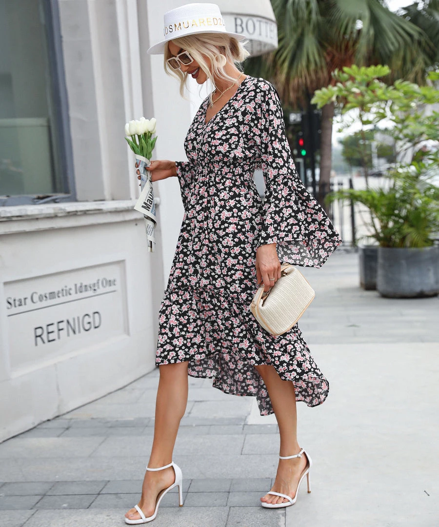 Our Anthem Dress is a vibrant black with red flower print. This lightweight, high low hemline dress is a relaxed, wrap fit you’re sure to love. The frill hemline and butterfly long sleeves float with the body as you move. Maternity friendly and perfect for a range of occasions like a picnic by the beach or brunch with the family. This flowy midi pairs beautifully with our sandals or heels for an effortless spring look!