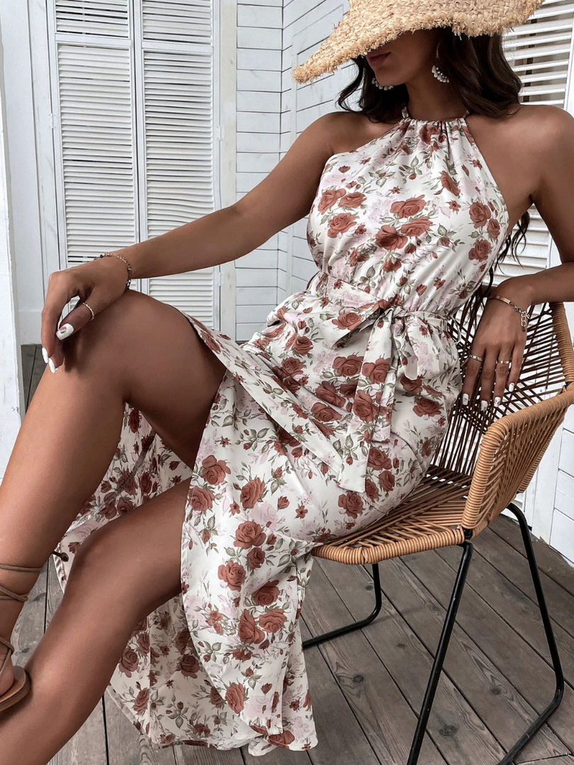Our Bonafique Dress comes in a beige tone with pink & rust rose print. This features a cross neckline, shirred bodice, an elastic waistband, and slip front which give this dress a flowy skirt. This flowy dress is an eye-catcher this summer season!