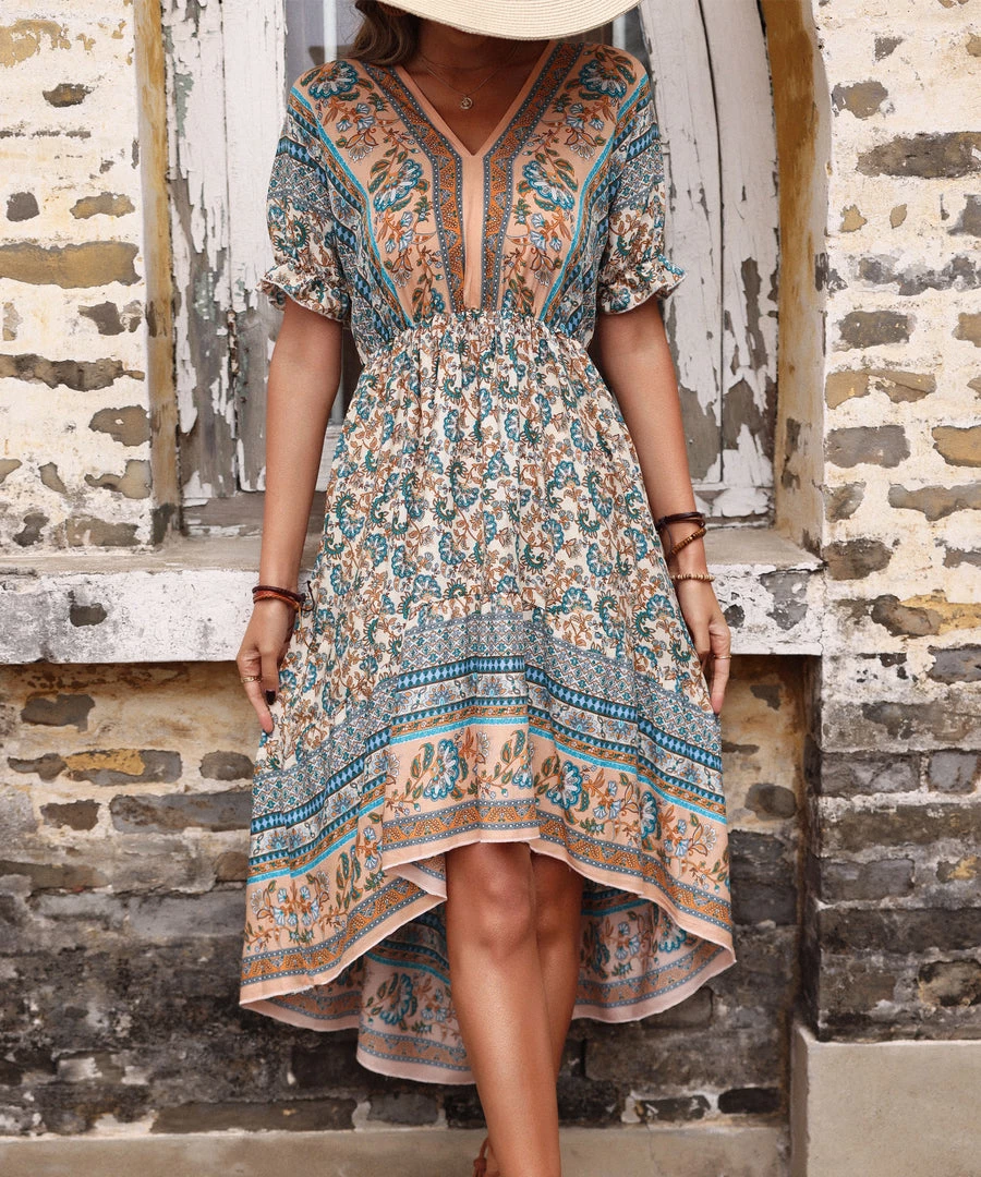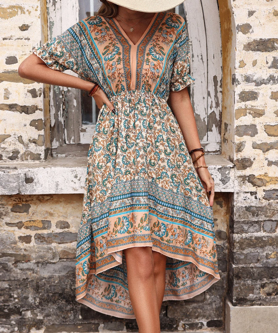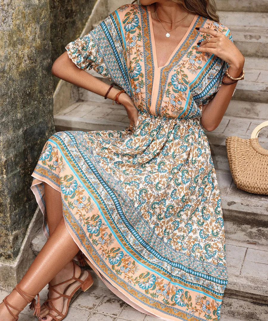 Our Cadena Dress comes in a apricot base with light blue, blush, and white prints. The relaxed fit midi features a soft v neckline, drawstring waist, butterfly sleeves making this the perfect balmy evening dress. This dress pairs beautifully with our wedges and chunky gold accessories.