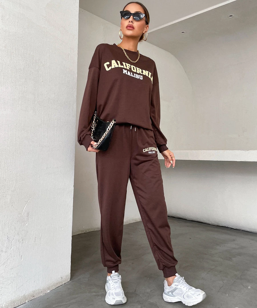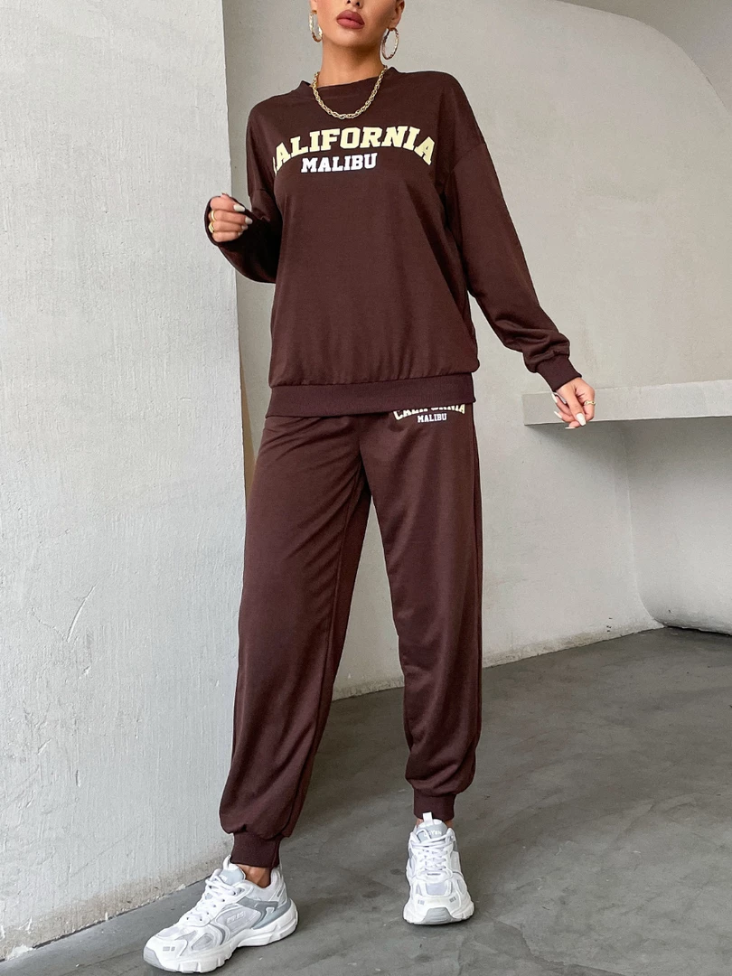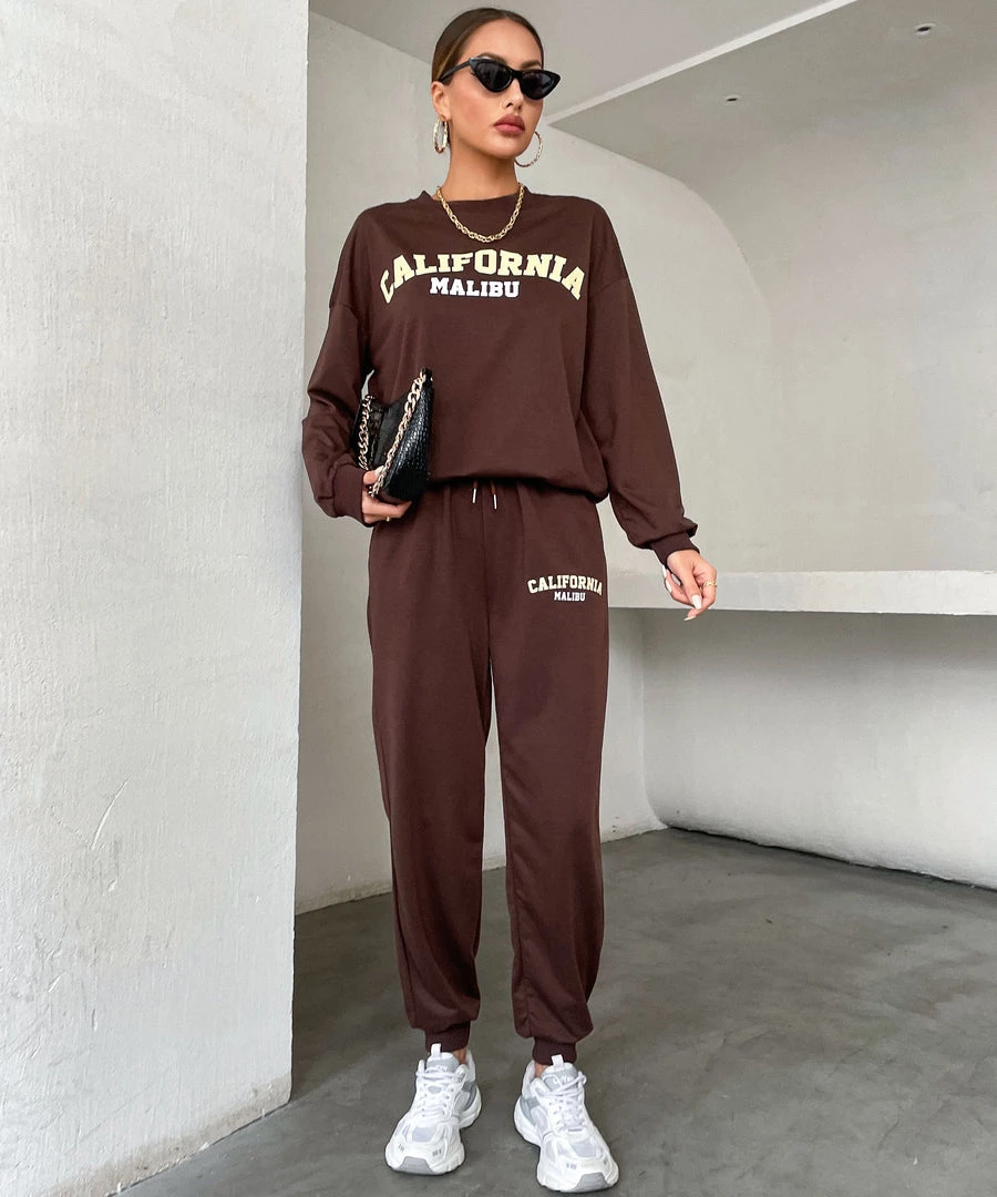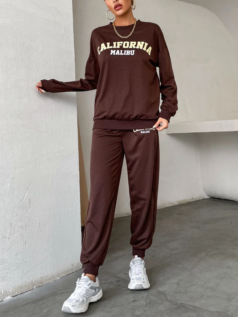 Get showy in this two-piece casual loungewear set that features a California Malibu graphic.