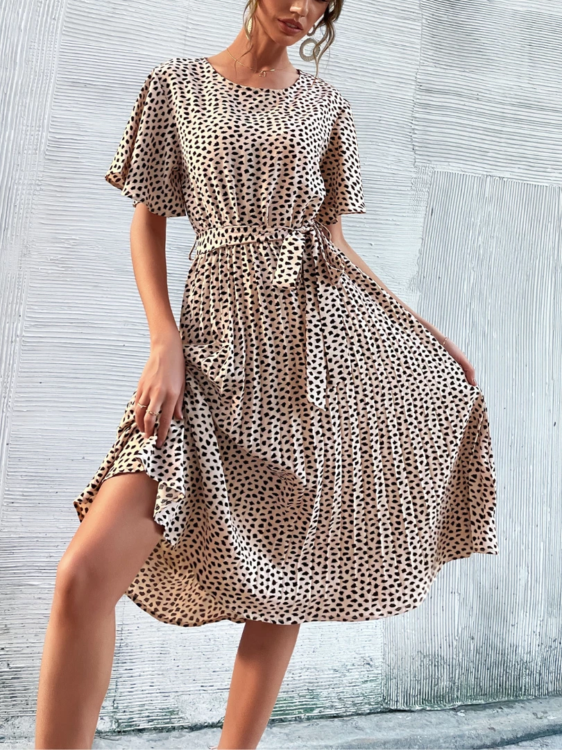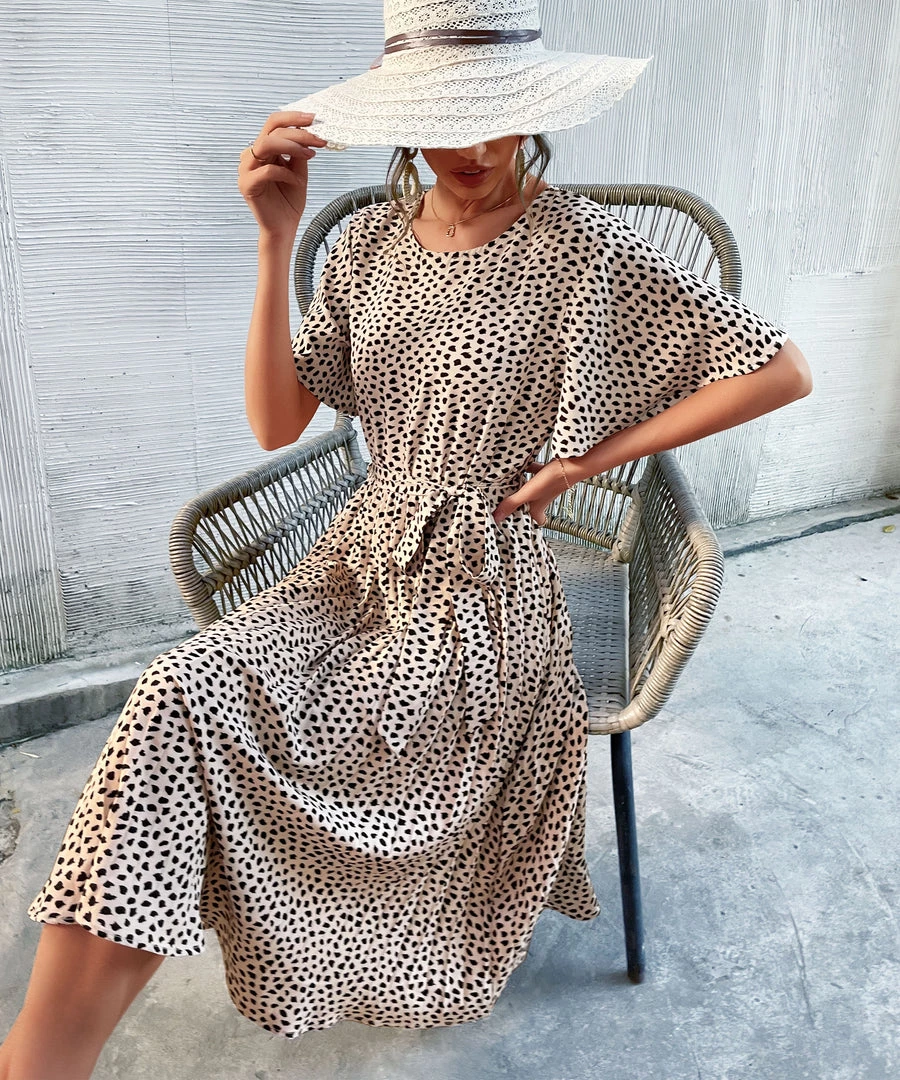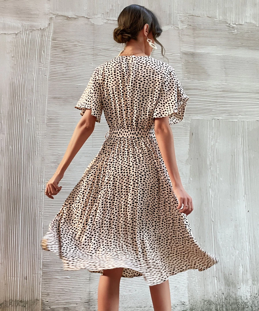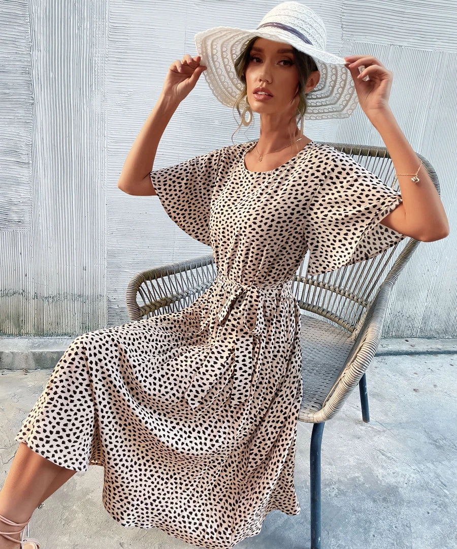 Our Calvinah Dress comes in a beige brown base, with a black spot print. It features a midi length, short sleeves, a center-back invisible zipper, lining and no stretch throughout the garment. This stunning midi pairs perfectly with our designer heels for an effortless trans-seasonal look!