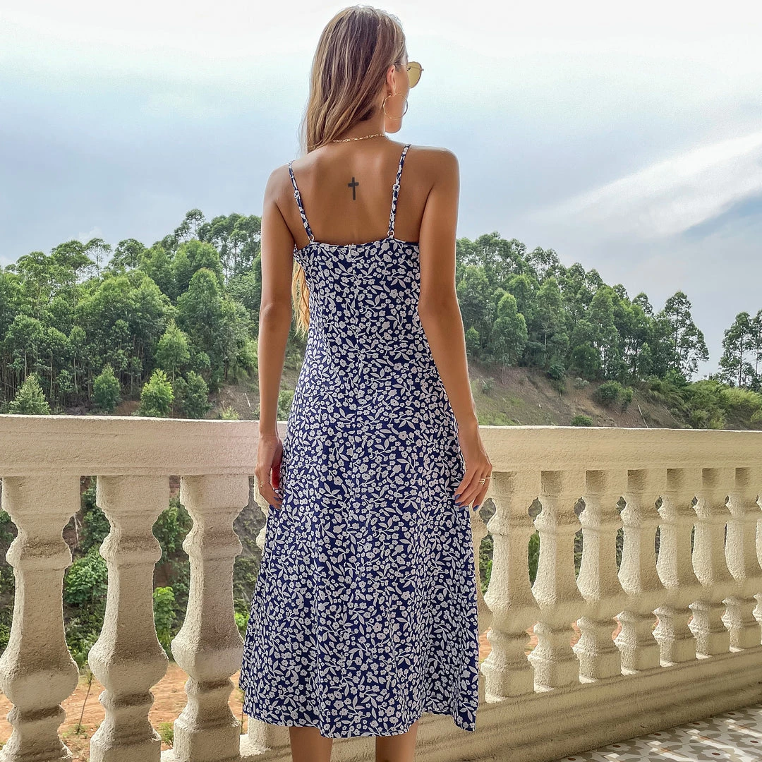 Our Cleo Floral Dress is a navy base with white floral print. This calming printed light weight dress is sure to be your fav Spring and Summer occasion dress. This midi features a shirred elastic back for a comfortable fit whilst the sweetheart neckline is a feminine and gorgeous addition. The side split makes walking a breeze and the invisible zip at the back is an effortless feature to this lovely dress.