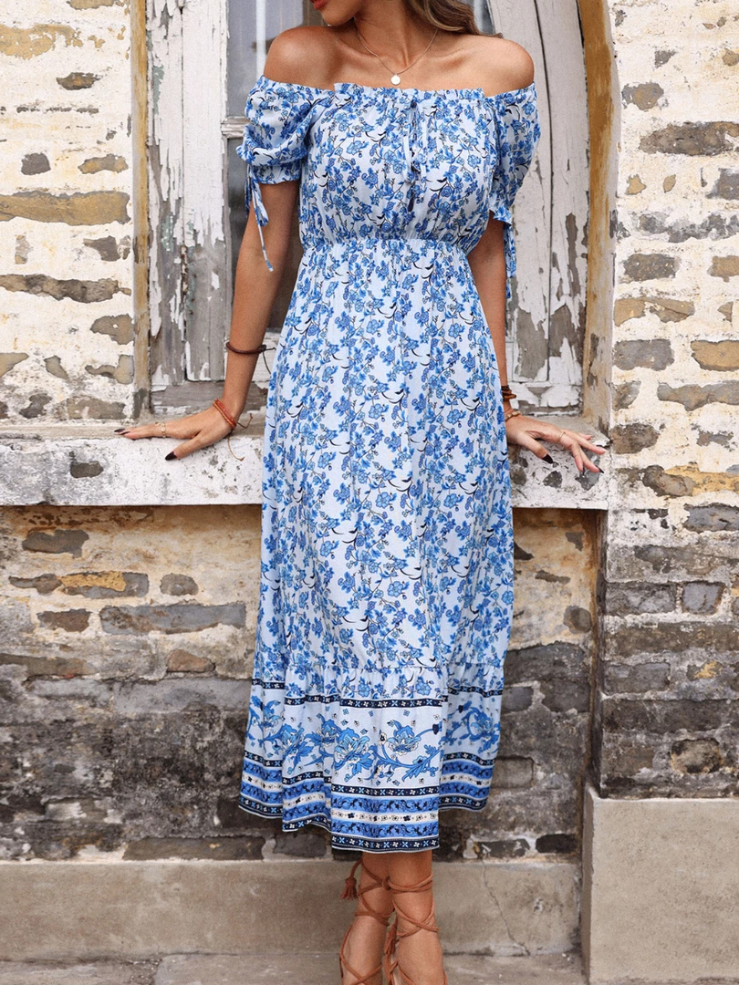 - Feature: Maxi length. Relaxed fit. Queen Anne neckline. Short sleeves.