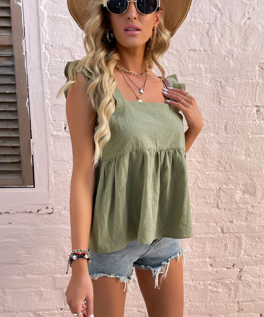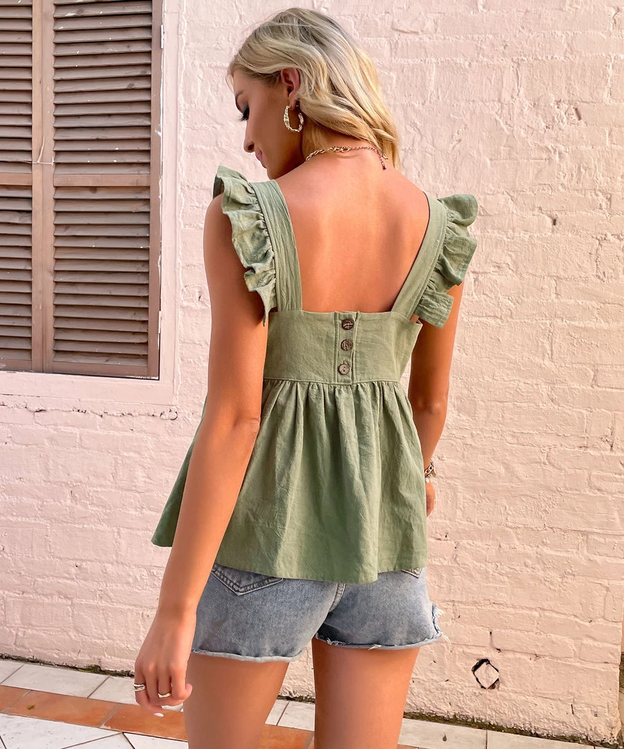 Our Graciela Top comes in a sage green tone color. This features a square neckline, Ruffle shoulders. The relaxed fit pairs beautifully with shorts or jeans, tan sandals, and minimal gold accessories!
