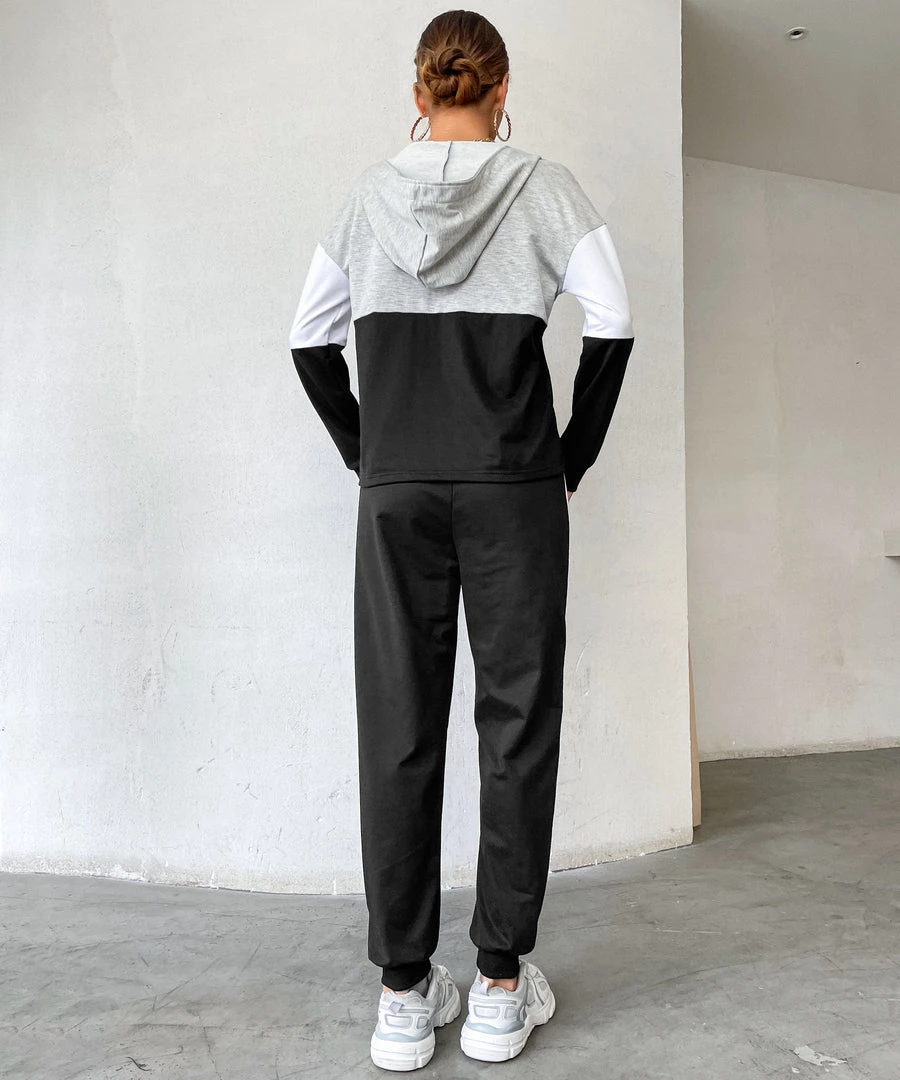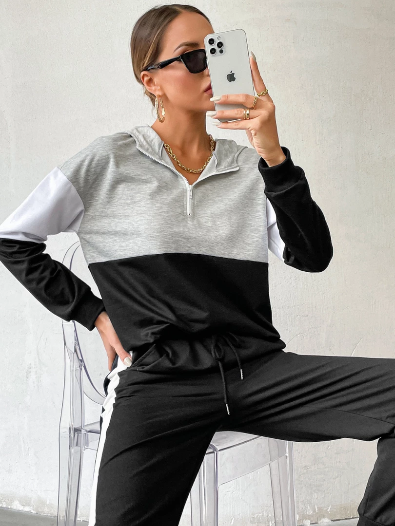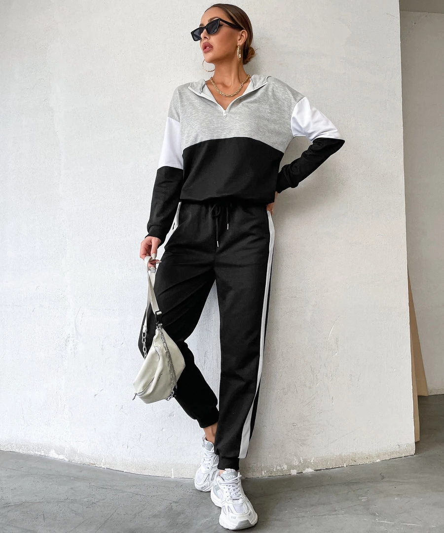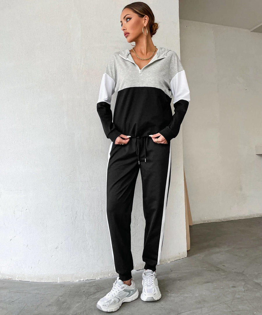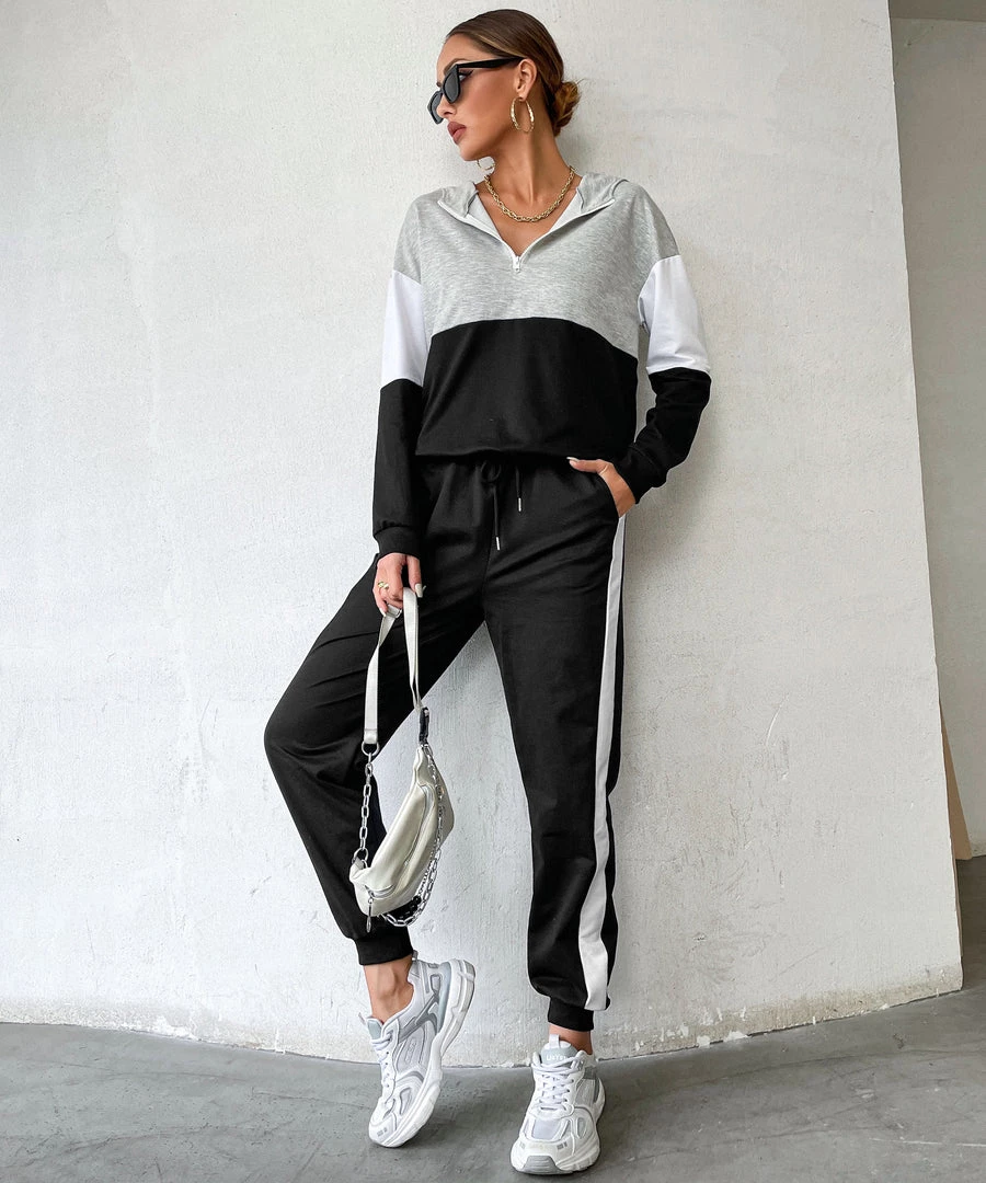 Get sporty in this two-piece athletic loungewear set that features a bold print accent and stretch fabric.