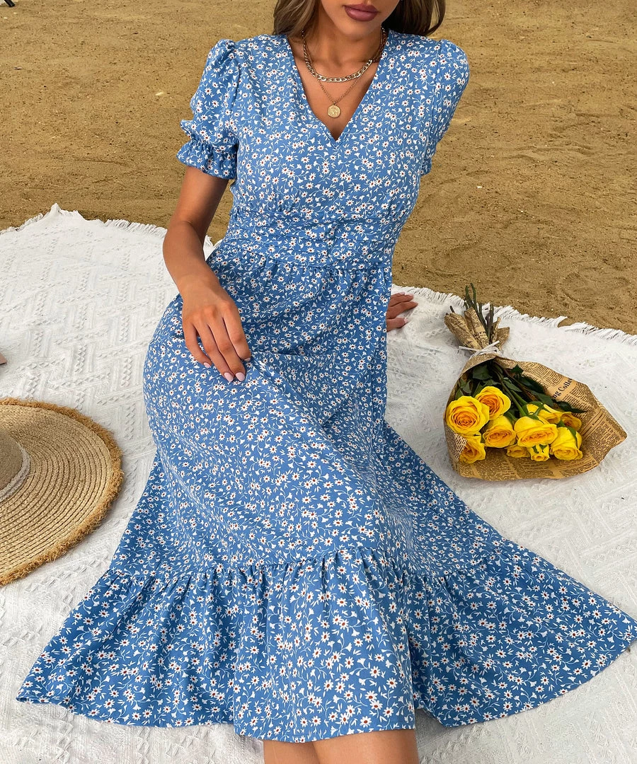 Our Juanita Dress comes in a blue tone base, with a white and red tone floral print. It features a v neckline and short bishop sleeves . This flowy midi pairs beautifully with our luxe heels for an effortless transseasonal look!
