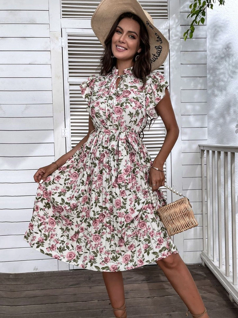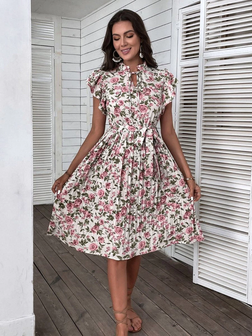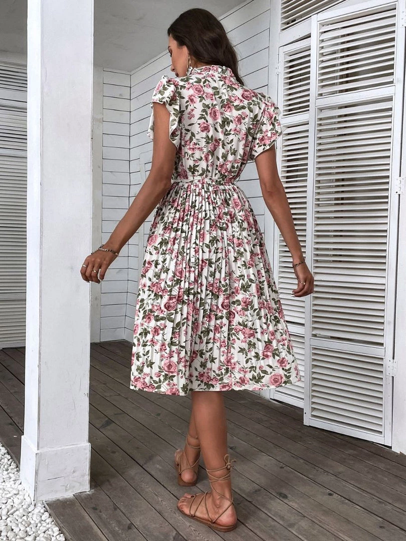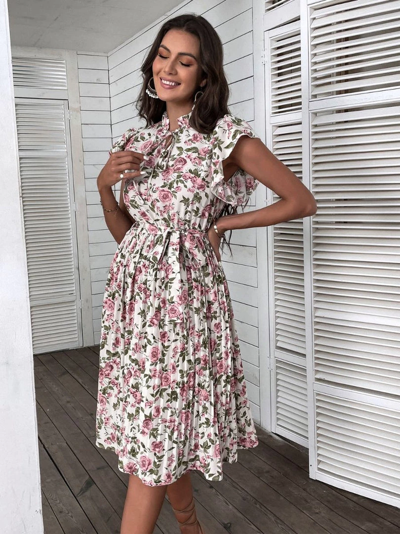 Our Kaidesse Dress comes in a classy cream base with pink rose print in white and green tones. A decolletage dress in its most refined form, this midi features a high neckline, short ruffle sleeves, pleated detailing and ruching on the waist giving your body an extra appeal!