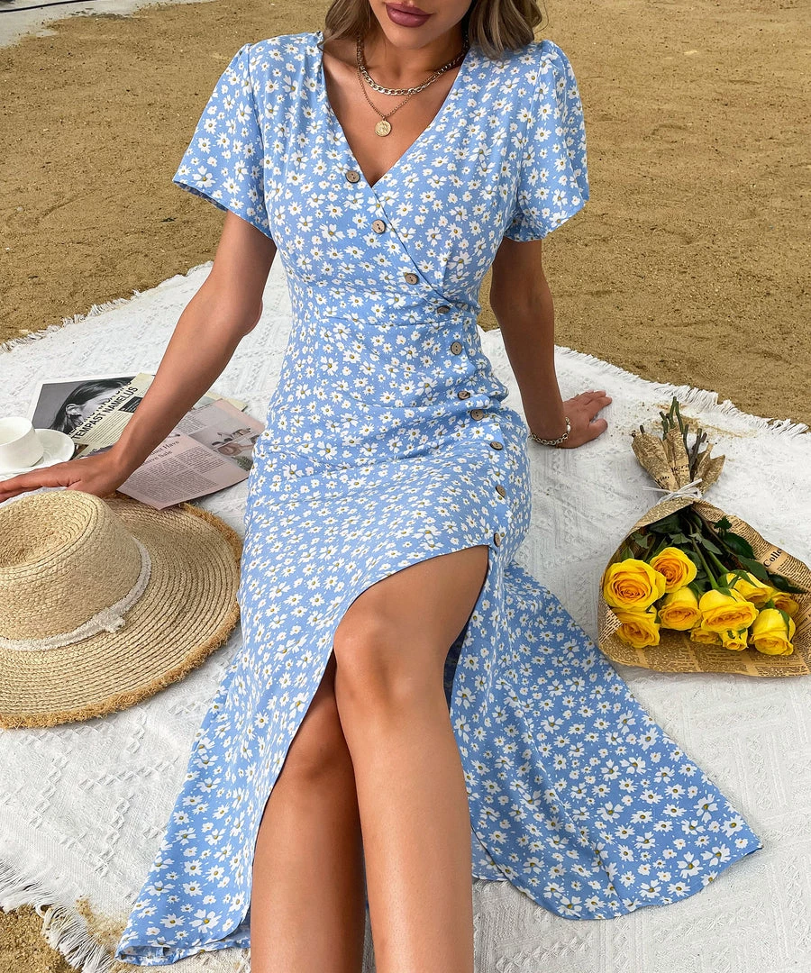Our Larkin Dress is a tropical dream. This midi comes in a stunning sky blue base with white toned floral print. This features short sleeves with a fabric tie and a v neckline with buttons down the front are flirty additions to this summery piece. Pair with a sunhat and your favorite tan sandals for the ultimate holiday look.