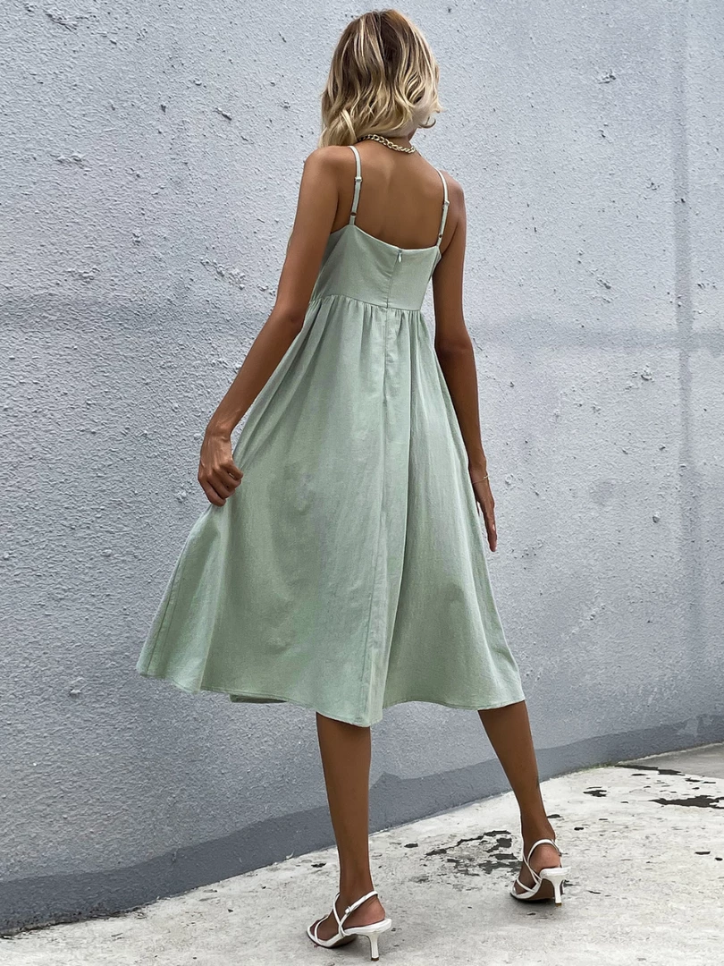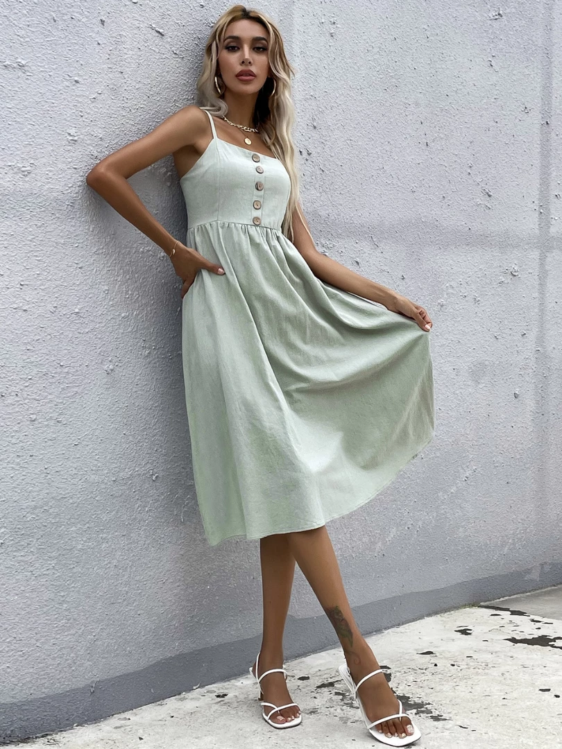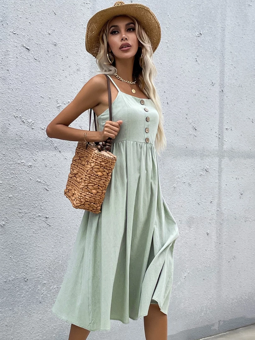 Our Lindsay Dress comes in a classic neutral light mint in a relaxed fit. This summer must-have features a straight neckline with adjustable shoulder straps and decorative buttons down the front. This piece is perfect for throwing on for a comfortable and effortless casual spring and summer look.