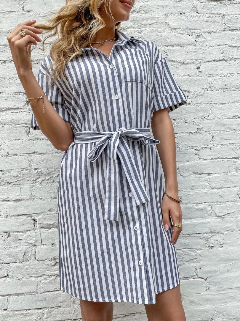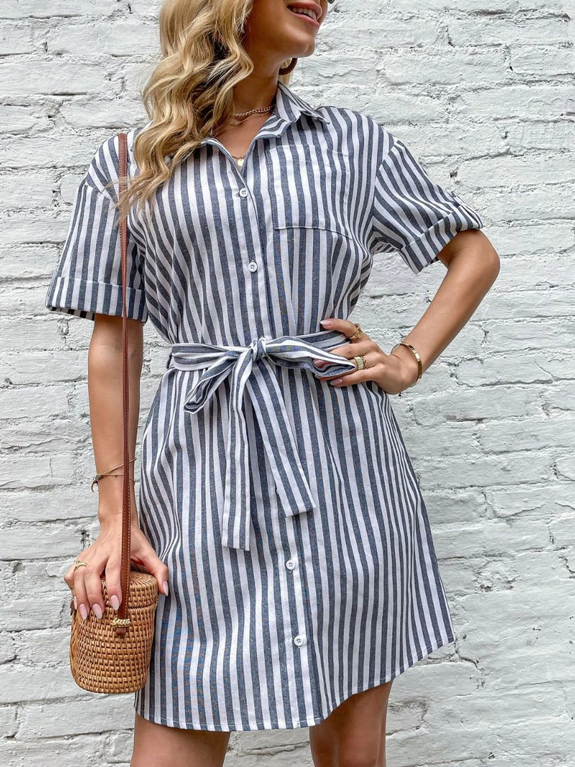 - Feature: Classic collar. A-line skirt. Mini length. Fabric belt. Functional buttons. Non-stretch. Relaxed fit. Pockets on sides.