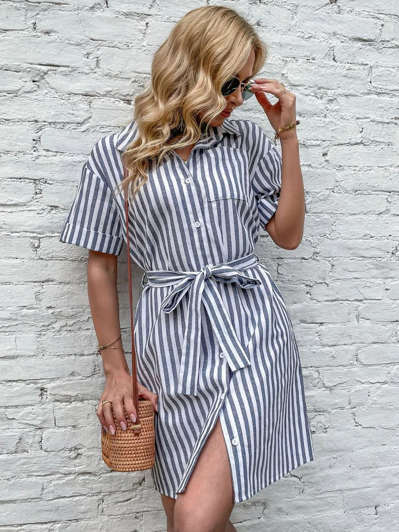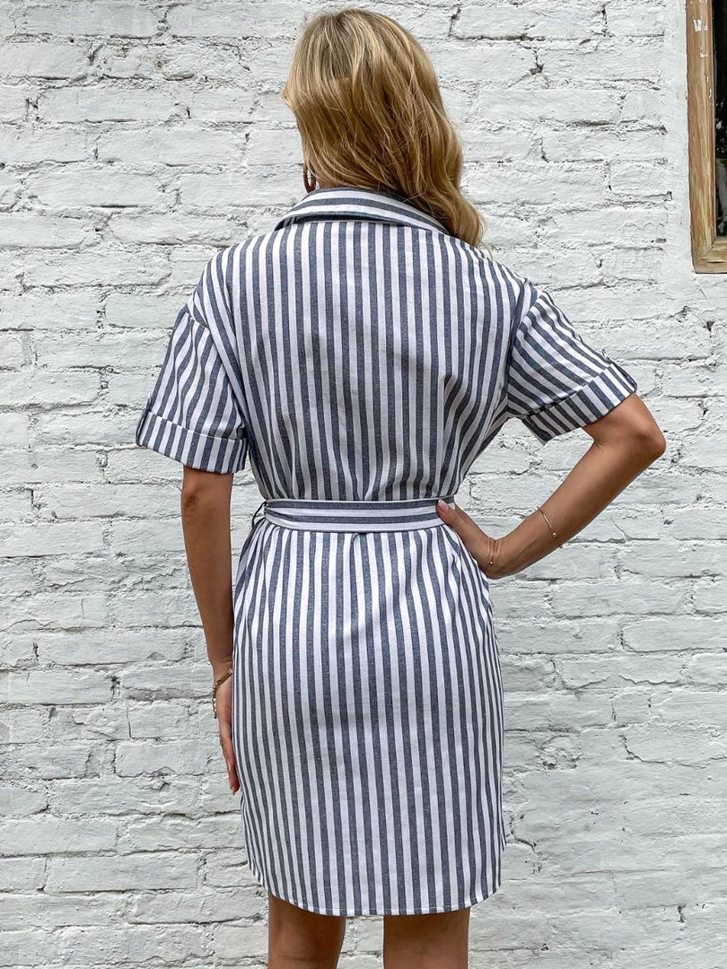 Our Antonette Dress comes in a grey and white stripe print. A sophisticated piece perfect for meeting your boyfriend’s parents for the first time, this modest mini features a classic collar, short sleeves, centre-front buttons, flowy a-line skirt, fabric belt and front slit. Wear it with our comfy flats and finish with a gold accessory!
