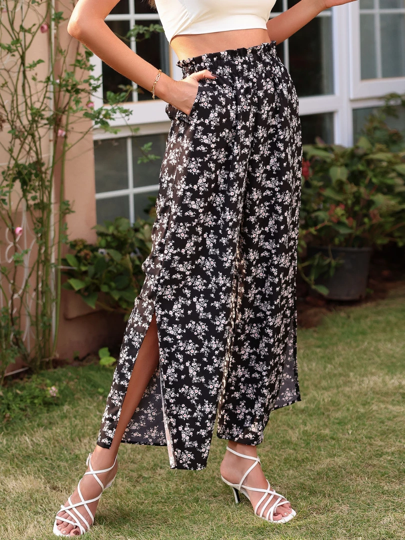 Our Jerry Pants come in a black tone base, with a white floral print. It features a maxi-length and a wide-leg silhouette. These flowy pants pair beautifully with a basic top for a fun spring look!