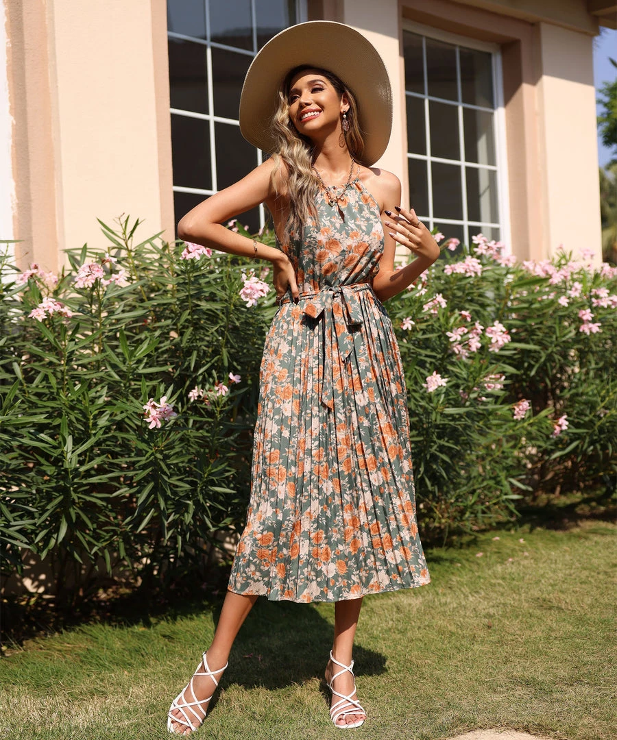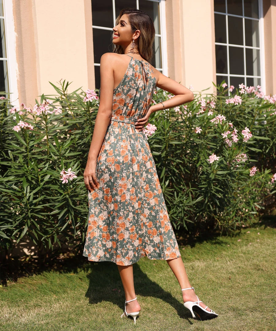 Our Margosha Dress comes in a moss green tone with white and pink rose print. This features a cross neckline, shirred bodice, an elastic waistband, and gathered fabric which give this dress a flowy skirt. This flowy dress is an eye-catcher this summer season!