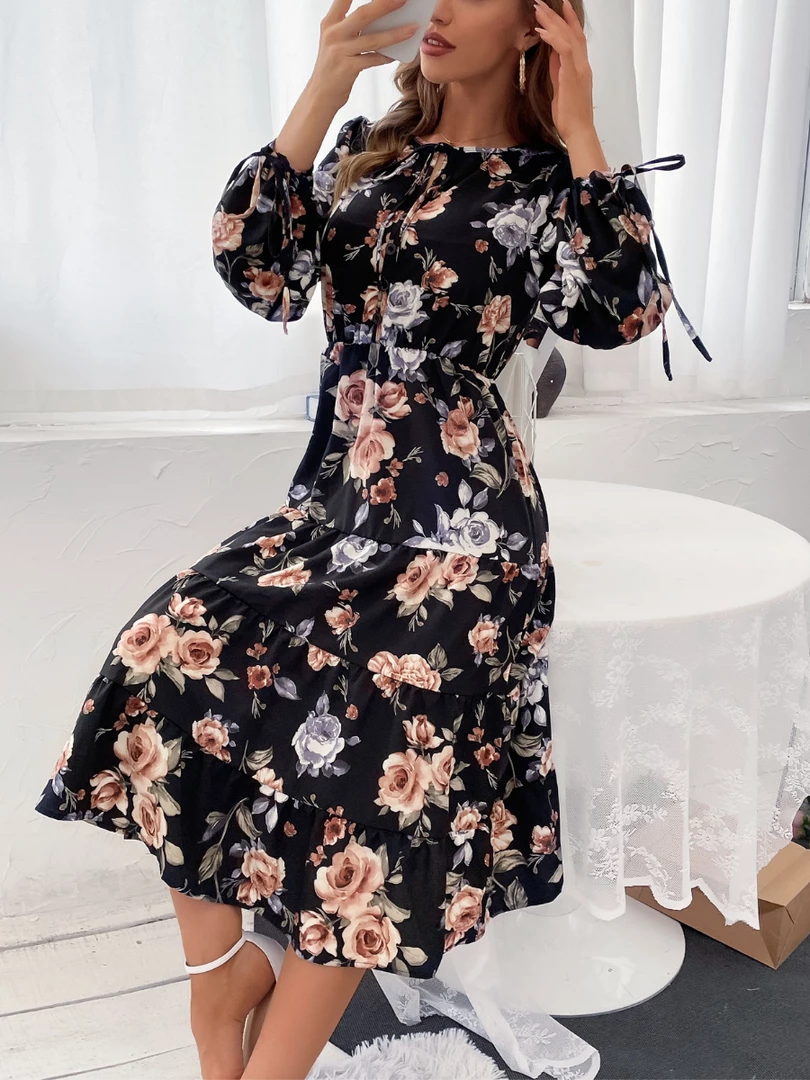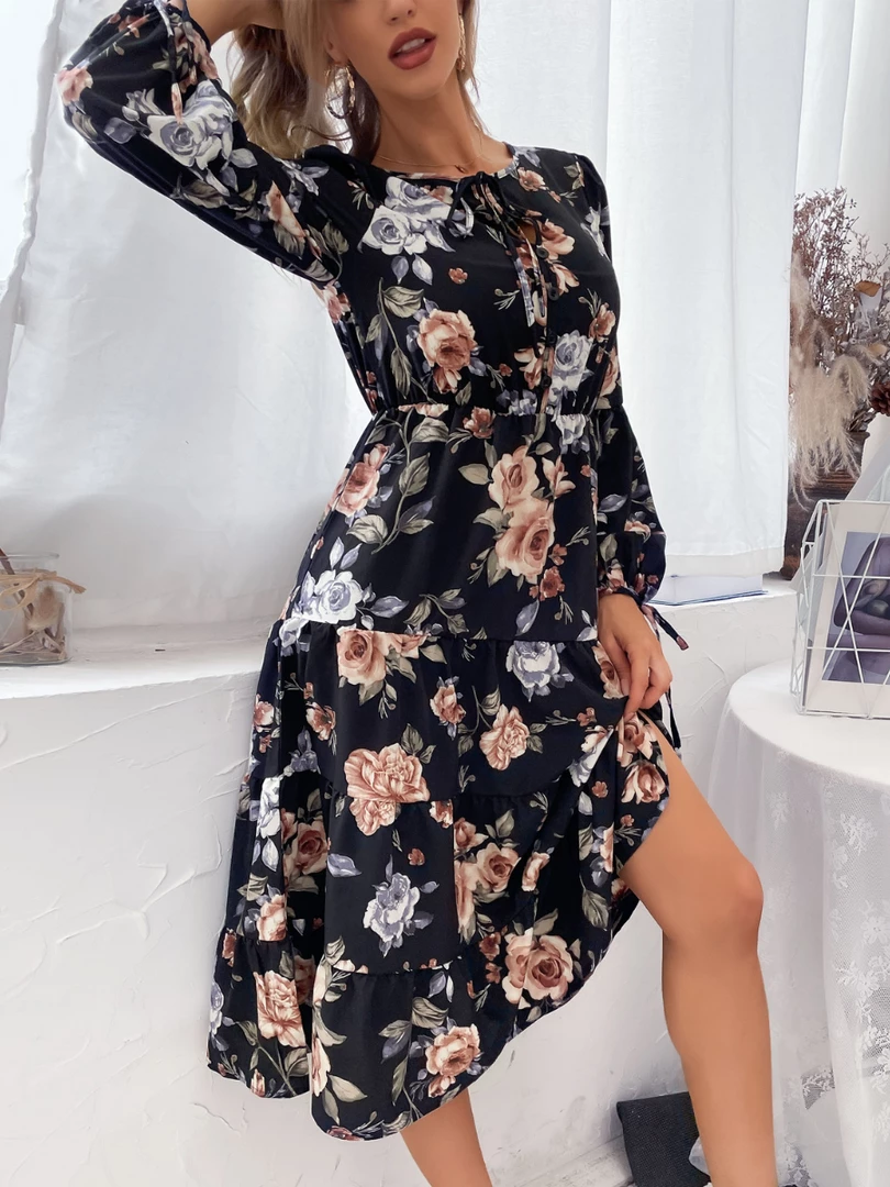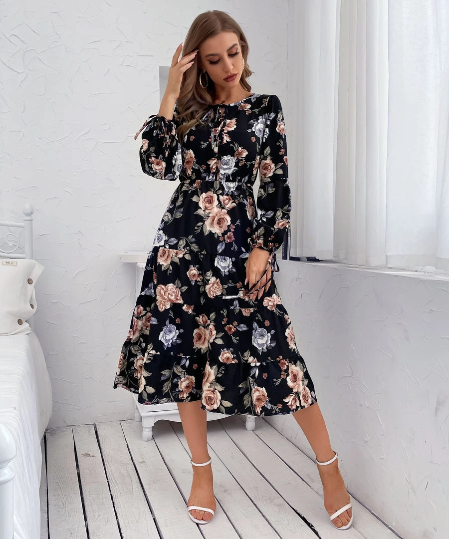 Our Given Floral Dress comes in black, grey, & light orange tone floral print. This relaxed fit midi features a layered high low hemline and wrap-like bust with an elastic waist and fabric waist tie to beautifully cinch in the figure. The tie hem long sleeves and relaxed fit make this ideal for maternity wear and provide ultimate comfort whilst looking your best.
