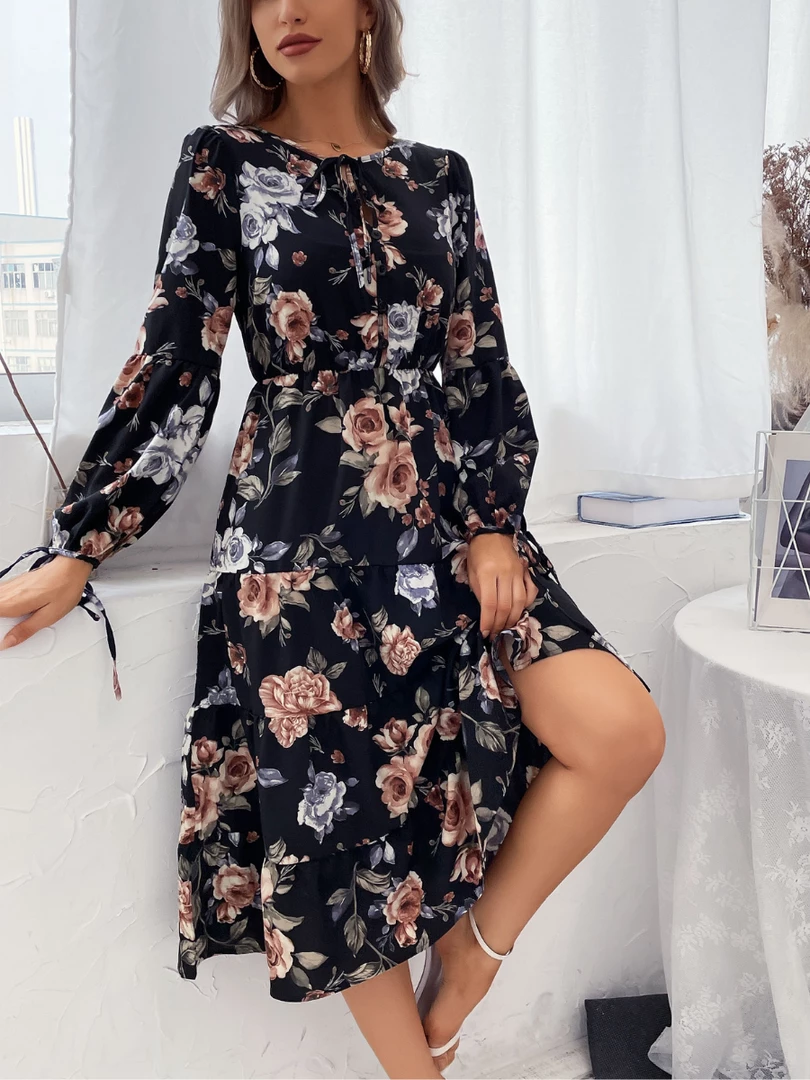- Feature: Midi length. Relaxed fit. V neckline. Long sleeves. Fabric waist tie.