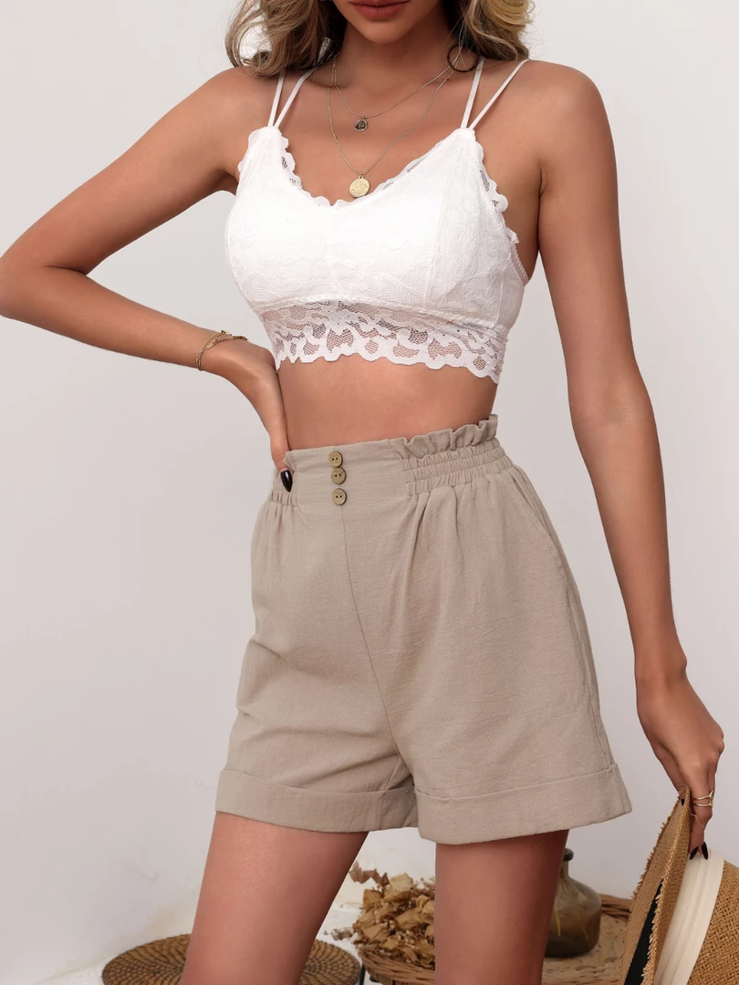 Our gorgeous Yola Shorts are your everyday dream pair of bottoms. They come in a classic khaki tone in a relaxed silhouette, sure to be your next summer favourite! The pockets on sides are functional with front buttons adding a touch of femininity to this style!