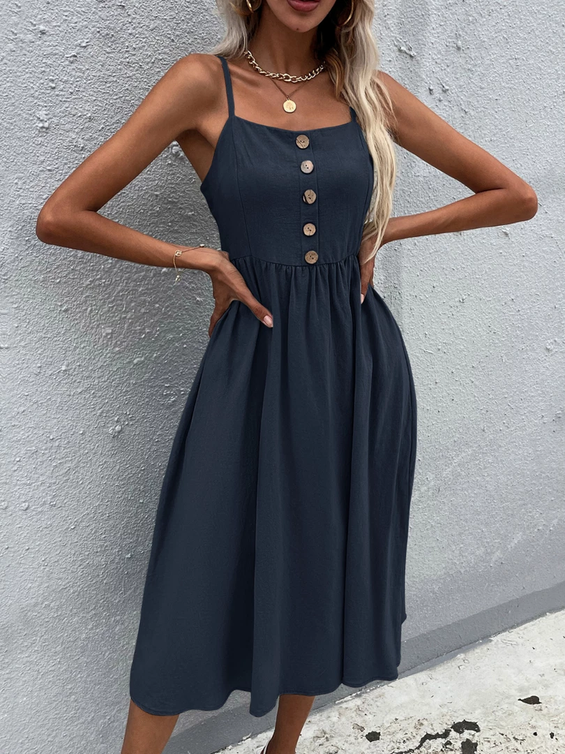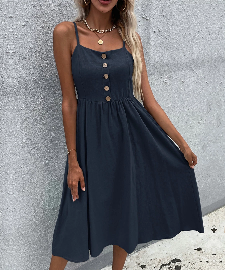 Our Lindsay Dress comes in a navy tone in a relaxed fit. This summer must-have features a straight neckline with adjustable shoulder straps and decorative buttons down the front. This piece is perfect for throwing on for a comfortable and effortless casual spring and summer look.