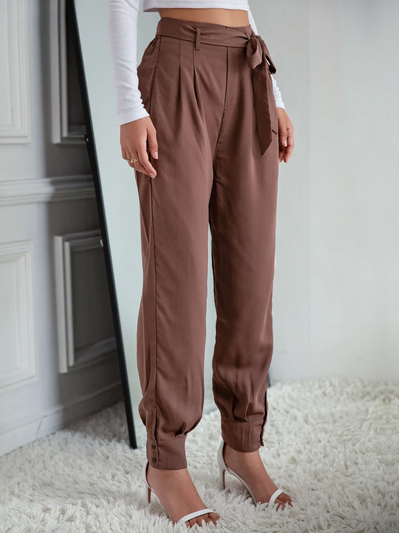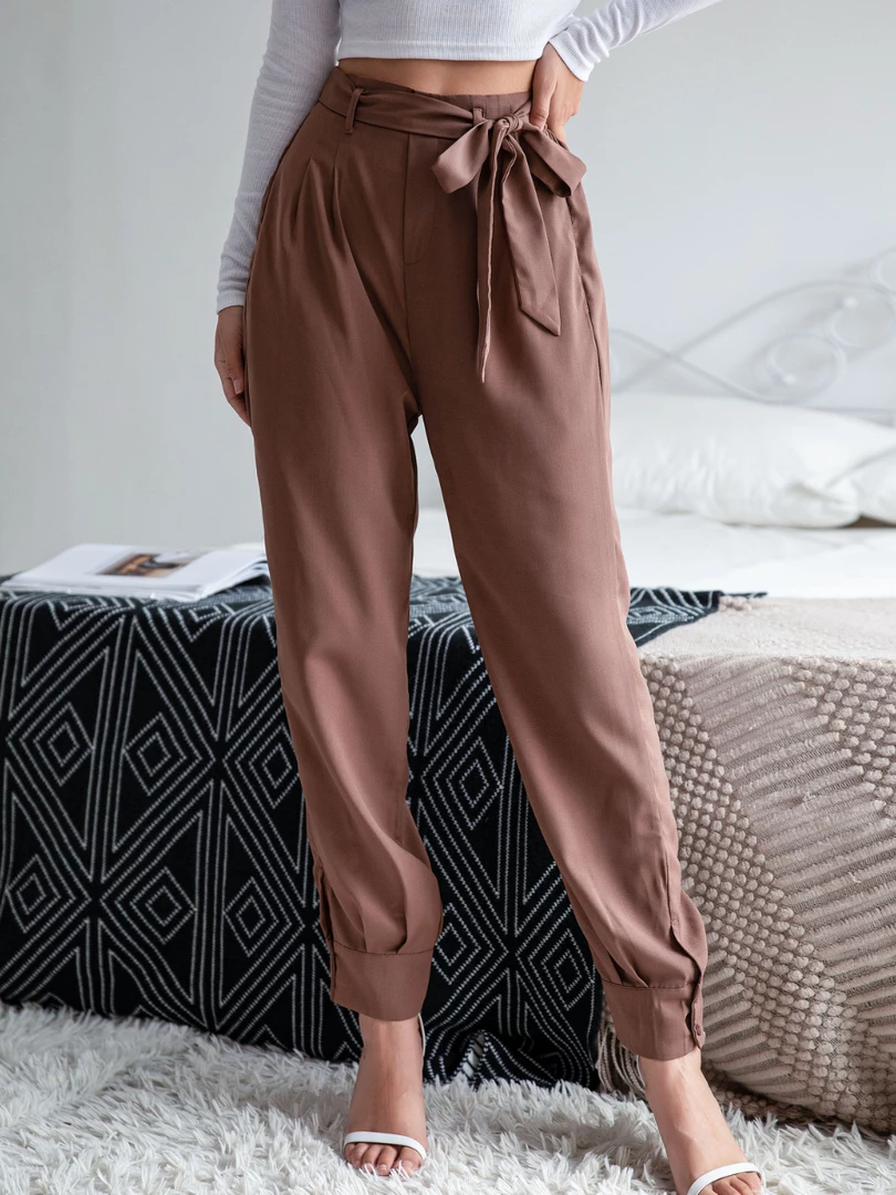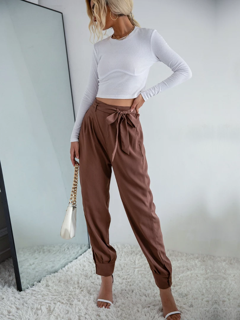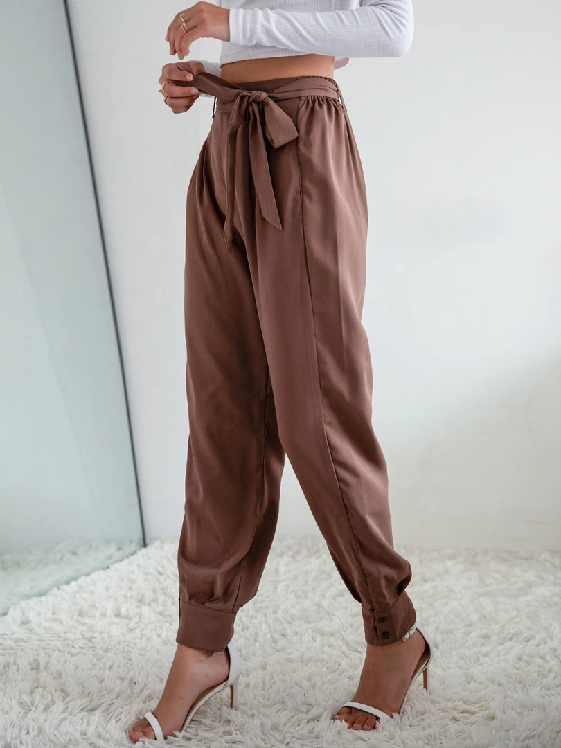Our Garnett Pants come in a coffee tone. They are a high-waisted style and feature elastic on the waist, a fabric waist tie and pockets on the sides. Pair with our favourite pair of heels for a classy casual look!