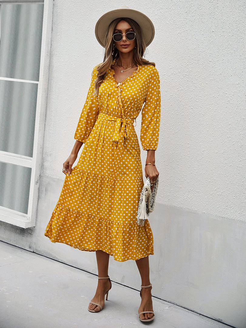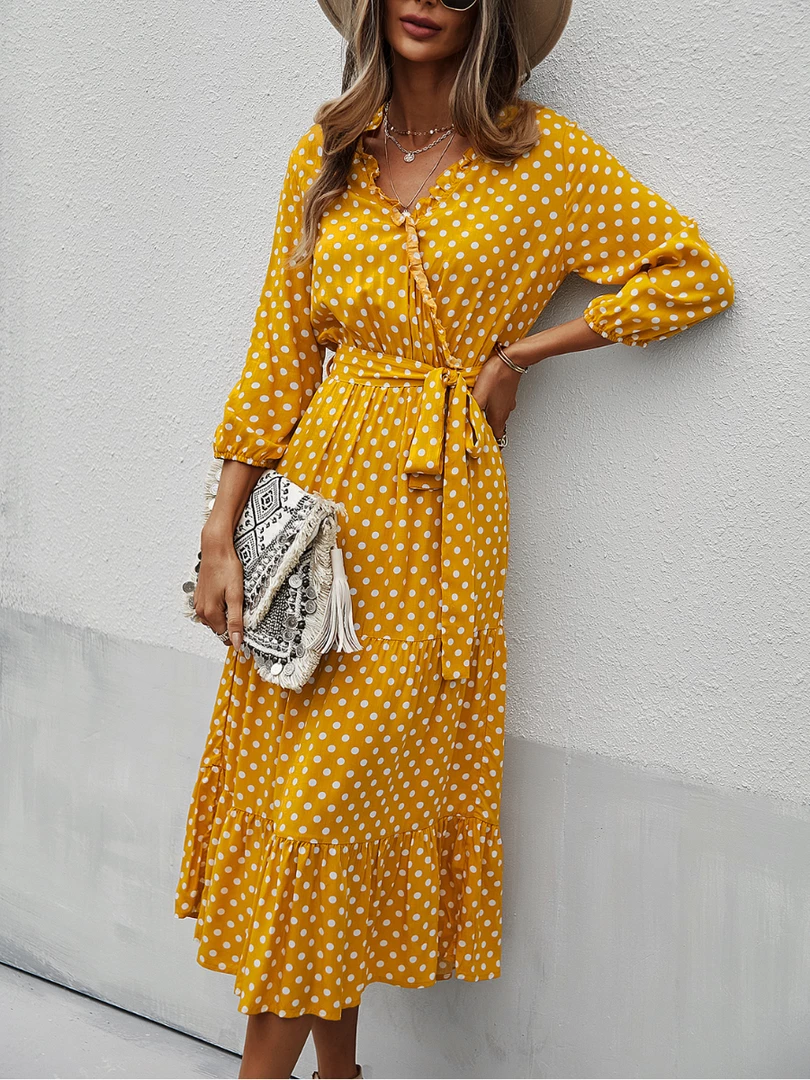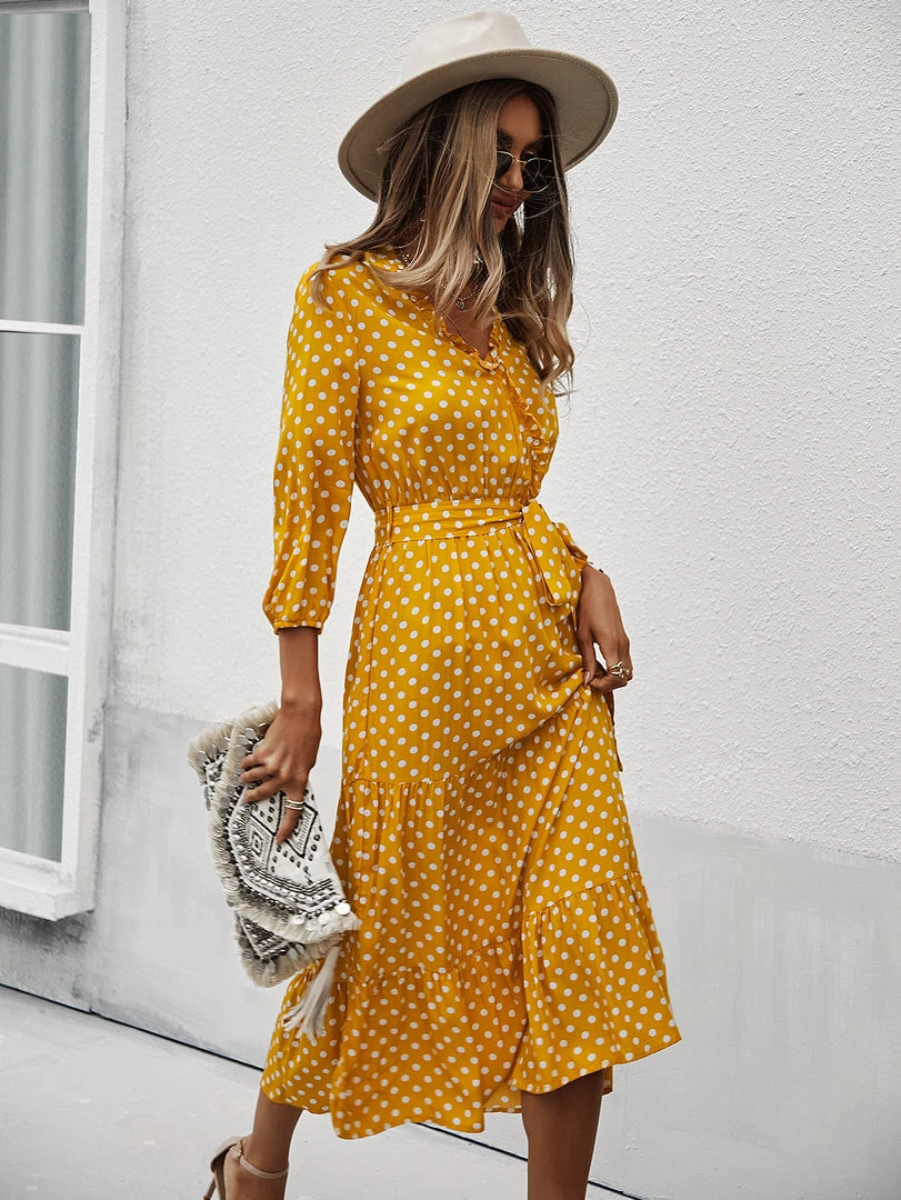 Our Alecta Dress in a wine tone base, with white spot print. It features a wrap V neckline, quarter sleeves, and a flowy skirt. This midi pairs beautifully with our heels or sandals for a fun casual look!