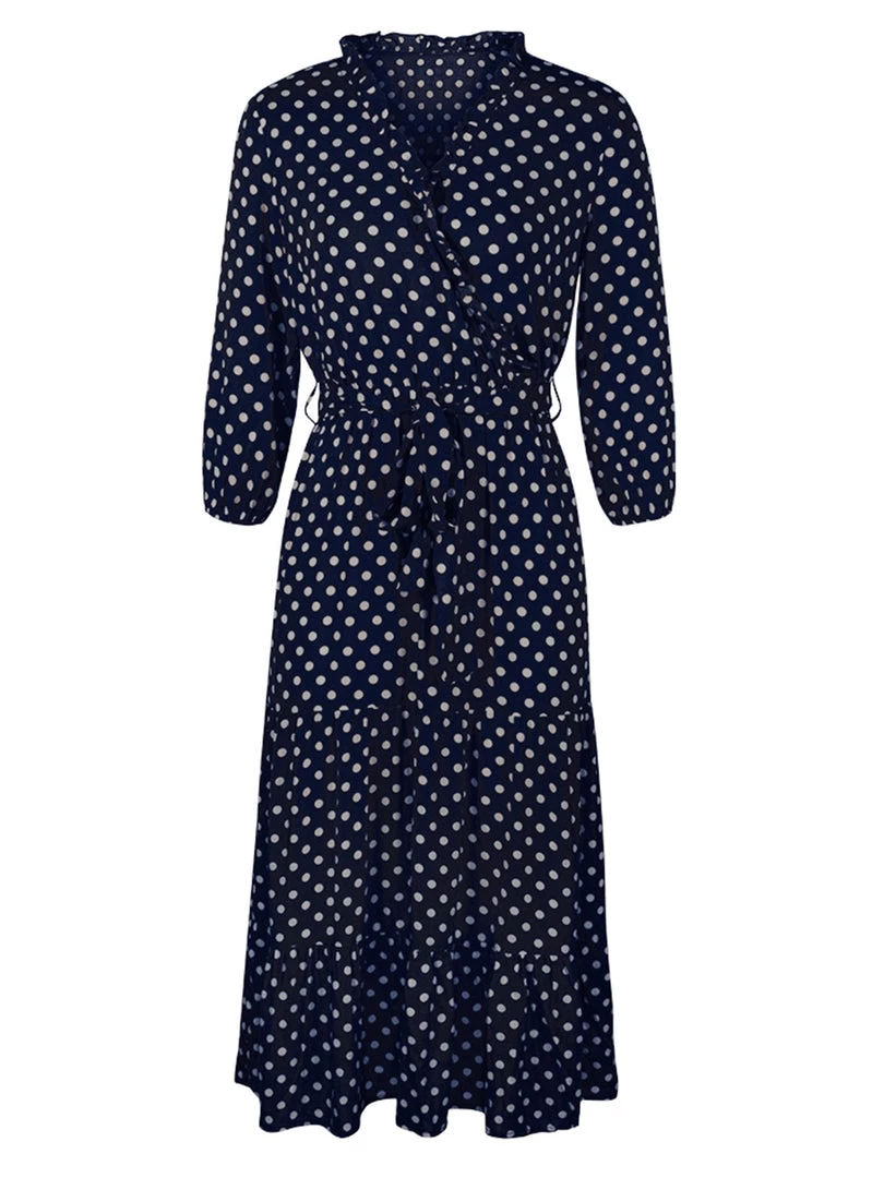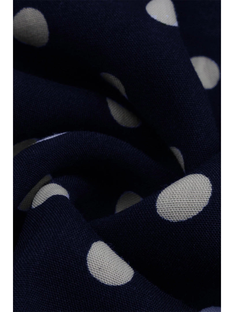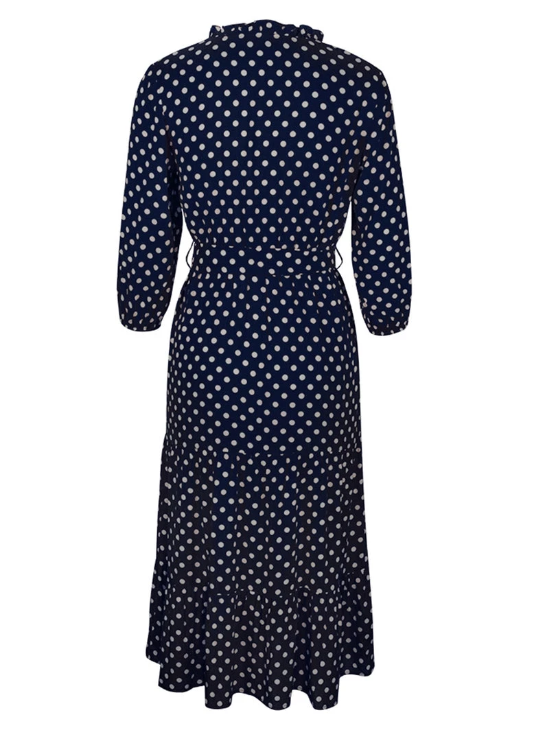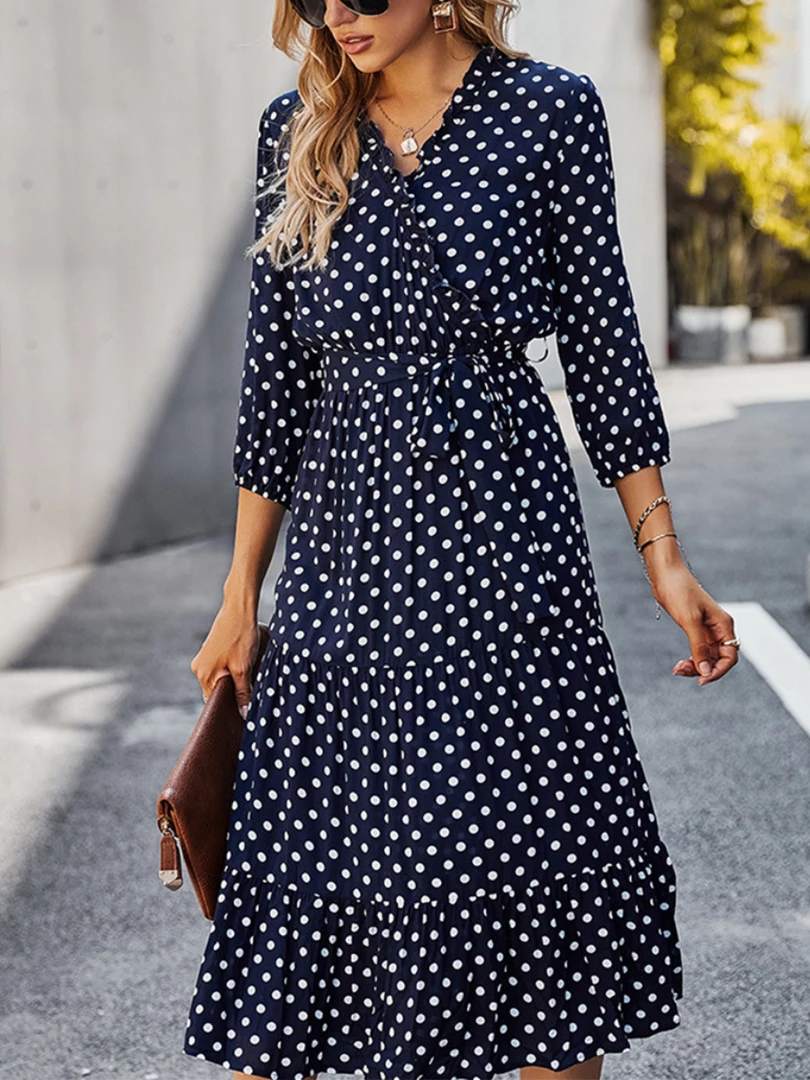 Our Alecta Dress in a navy blue tone base, with white spot print. It features a wrap V neckline, quarter sleeves, and a flowy skirt. This midi pairs beautifully with our heels or sandals for a fun casual look!
