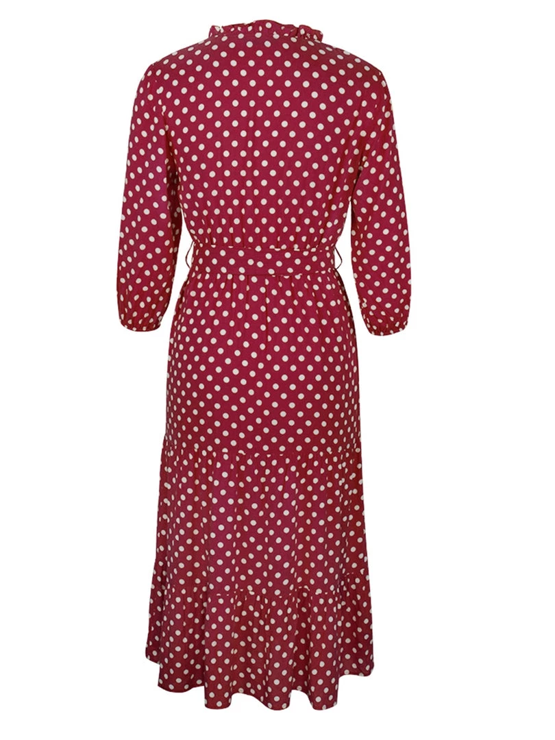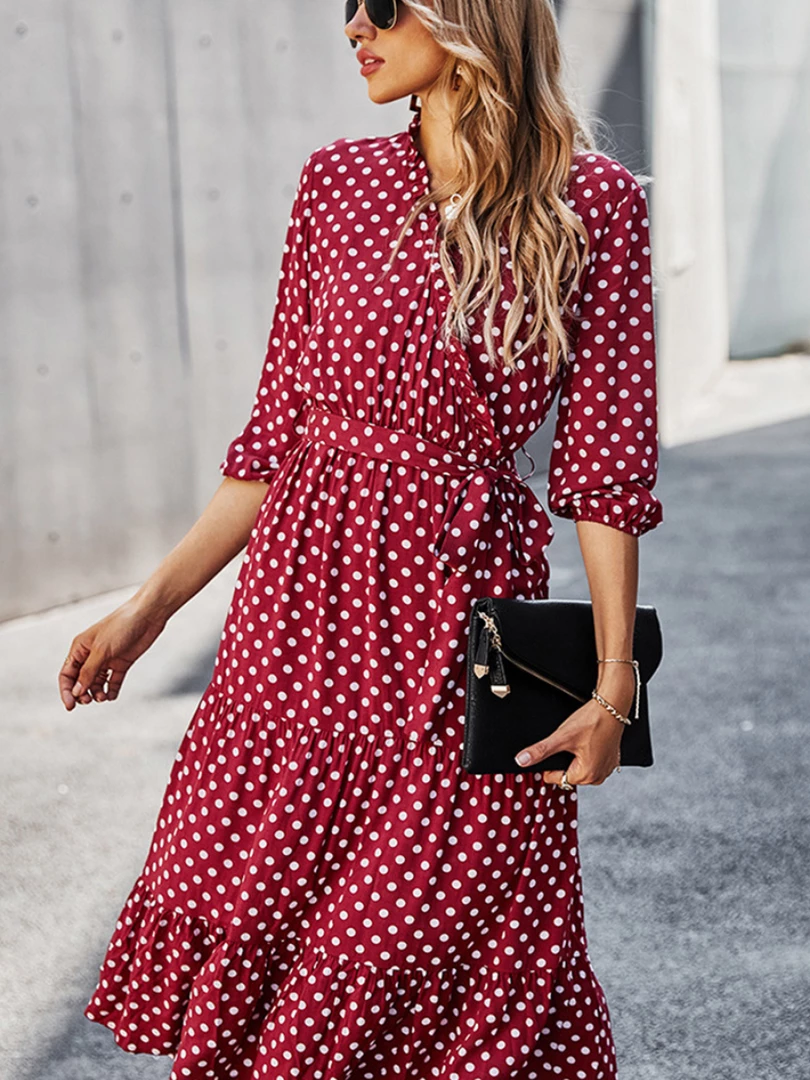 Our Alecta Dress in a wine tone base, with white spot print. It features a wrap V neckline, quarter sleeves, and a flowy skirt. This midi pairs beautifully with our heels or sandals for a fun casual look!