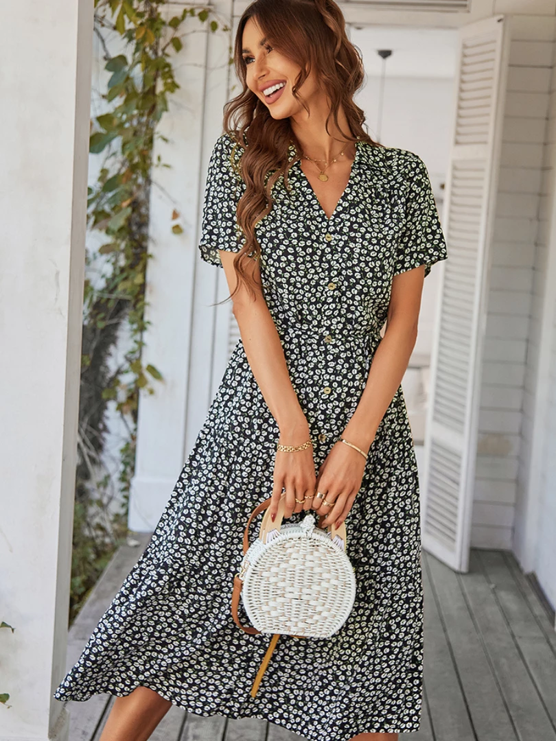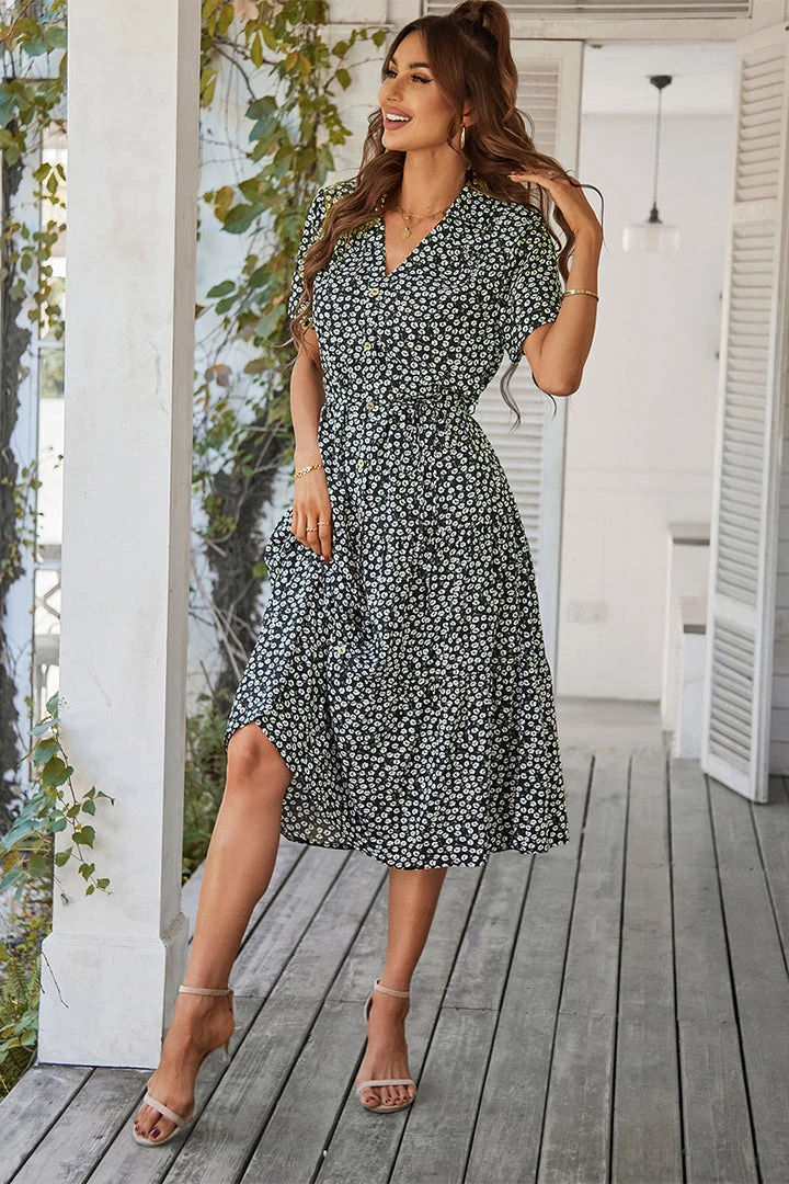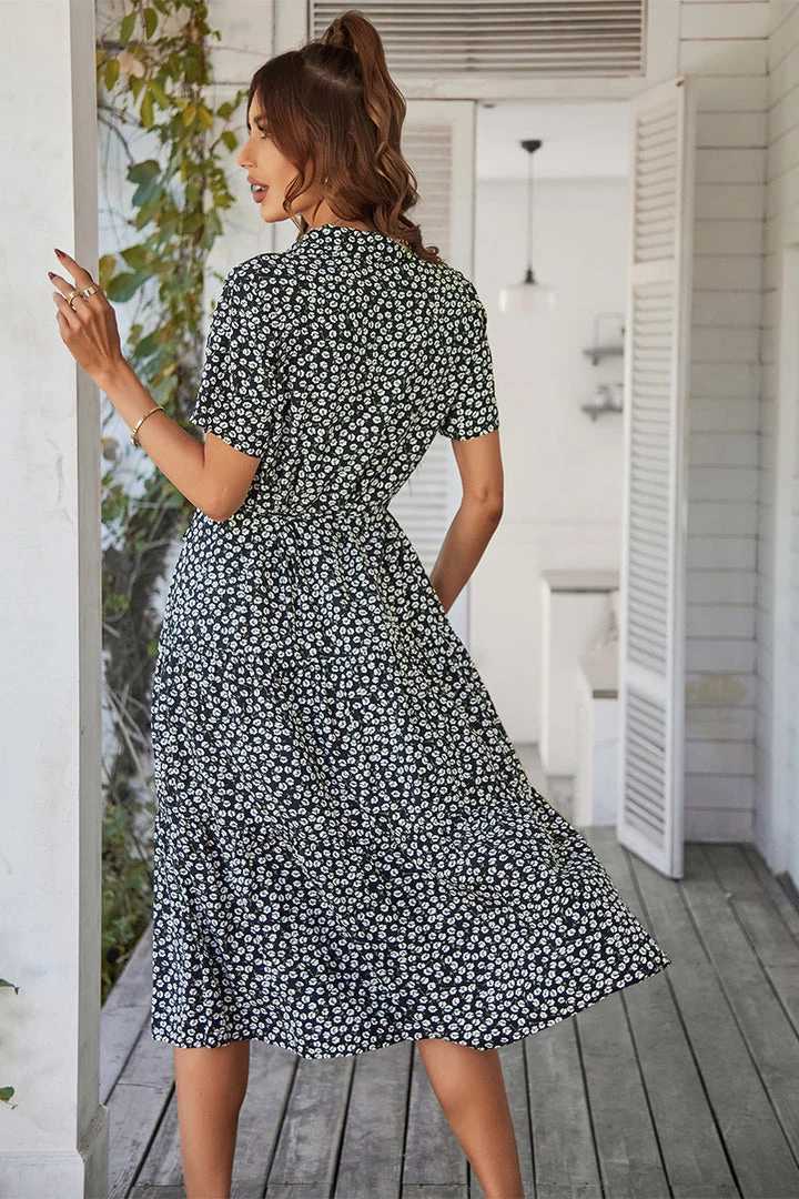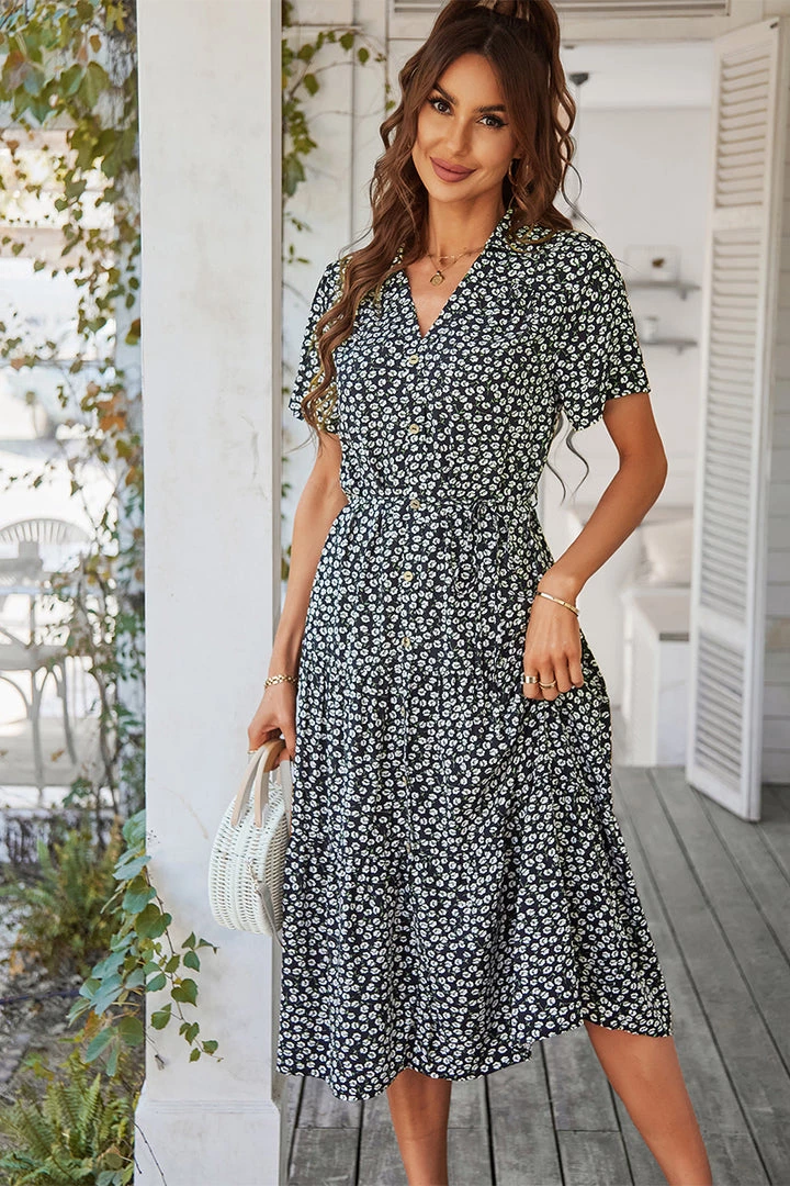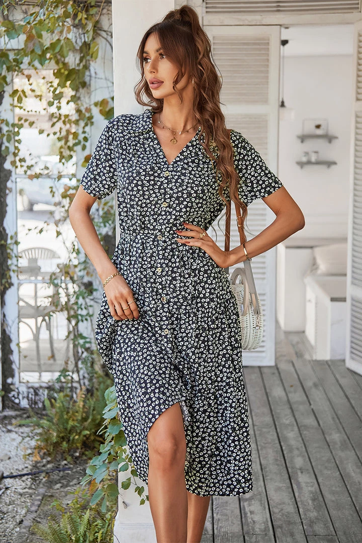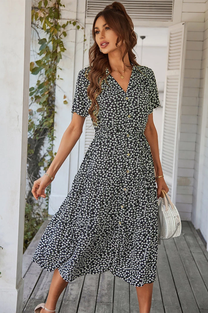 Our Alvina Dress comes in a black tone base, with a white print. It features a v neckline and short sleeves for a relaxed, comfortable fit. This flowy midi pairs beautifully with our heels or sandals for a fun casual look!