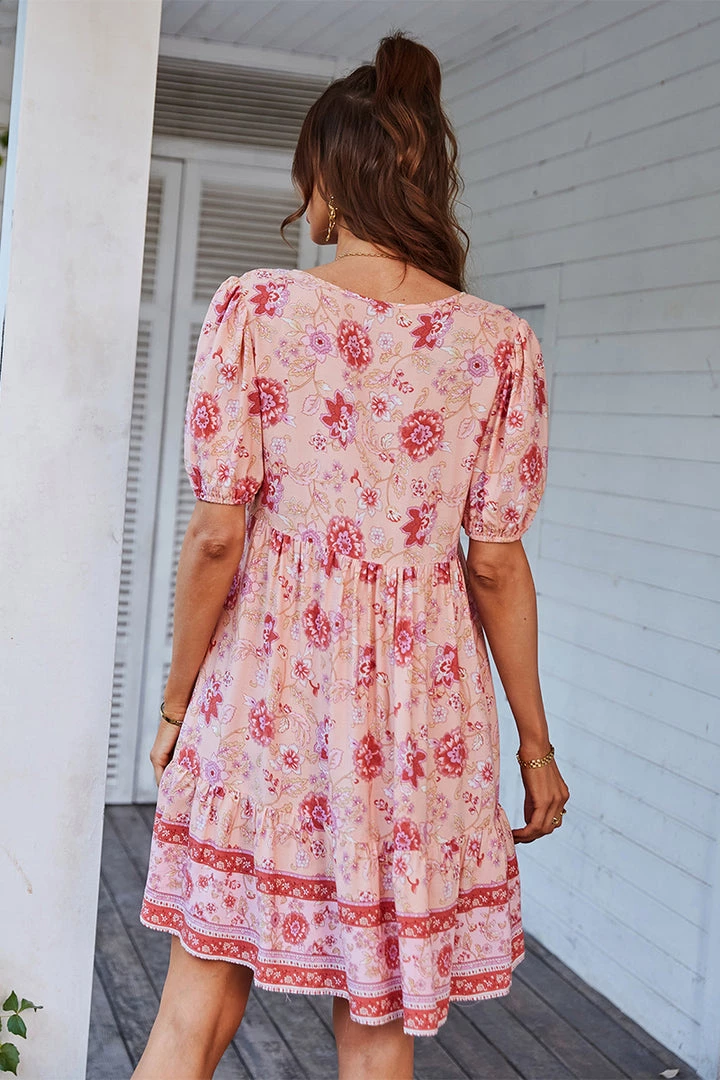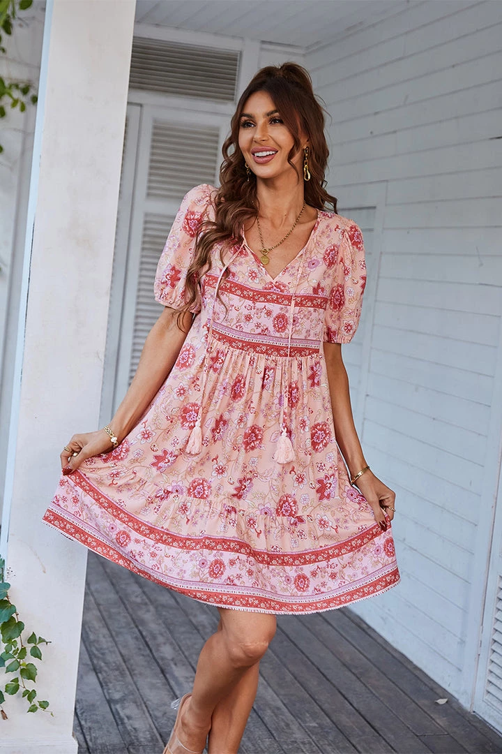 Our Aurina Dress comes in a multi print. It’s a gorgeous lightweight material perfect for transitioning you to Spring. The peasant v neckline with tassel finishes is a gorgeous addition to this bohemian style. The short bishop sleeves are cinched with elastic on the cuffs making this practical and comfortable. The mini length is perfect for showing off your gorgeous legs!This boho midi pairs beautifully with our heels or sandals for a fun casual look!
