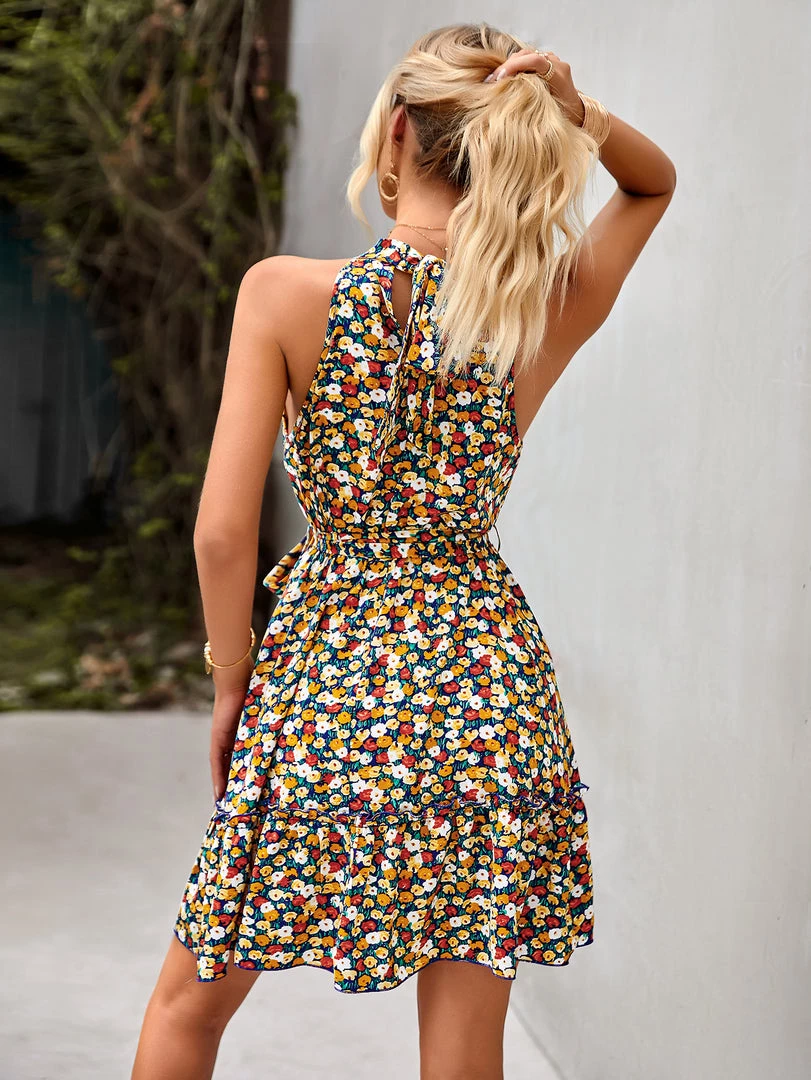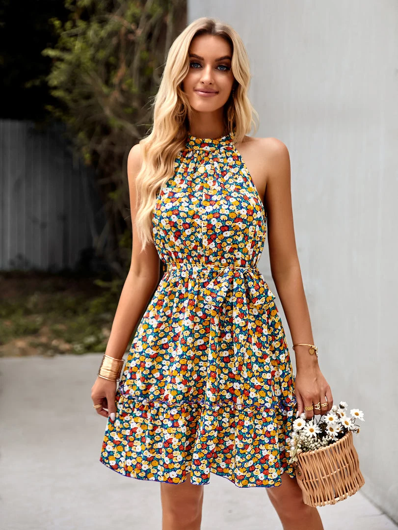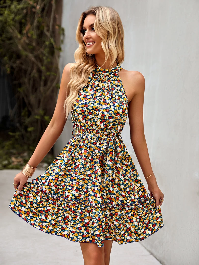 Our Bonafique Dress is a yellow, red, green & cream floral print. This mini is a relaxed fit featuring a tie waist and high twist neckline detail that exudes sophistication. Pair with our classic mules and tan accessories for a demure look!