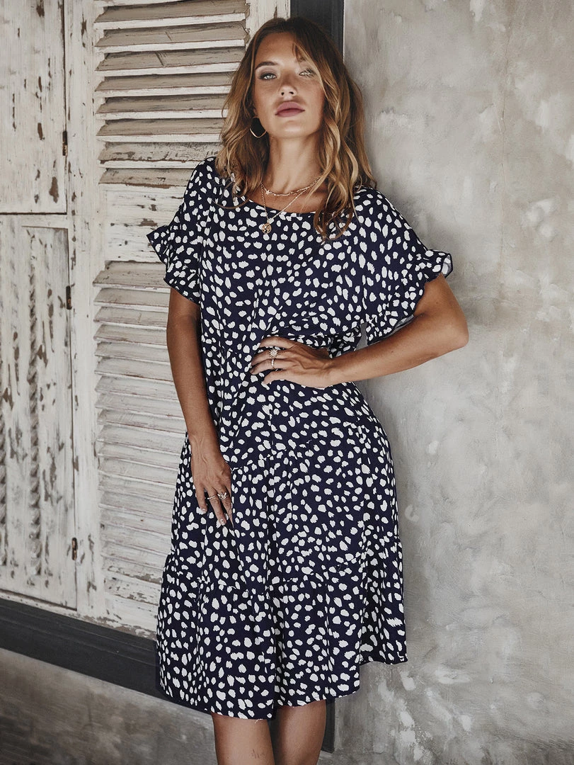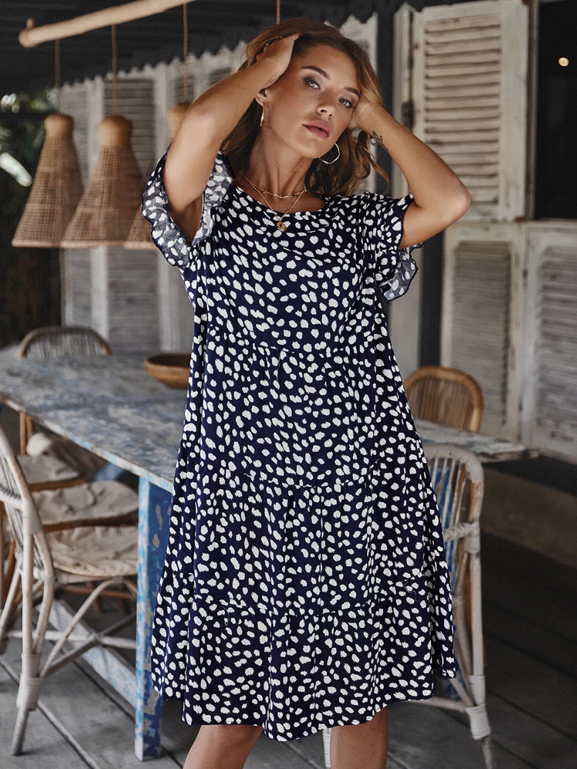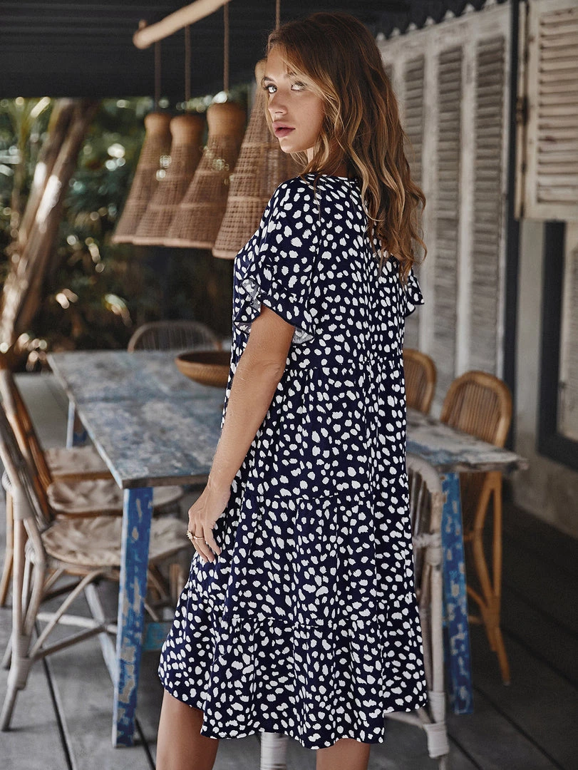 Our Bronwyn Dress comes in a navy toned base featuring a delicate white spot print in a relaxed fit. This mini features a keyhole back held with a button fastening and frill detailing on the hemline. This piece is perfect for throwing on and grabbing coffee with the girls on a spring day.