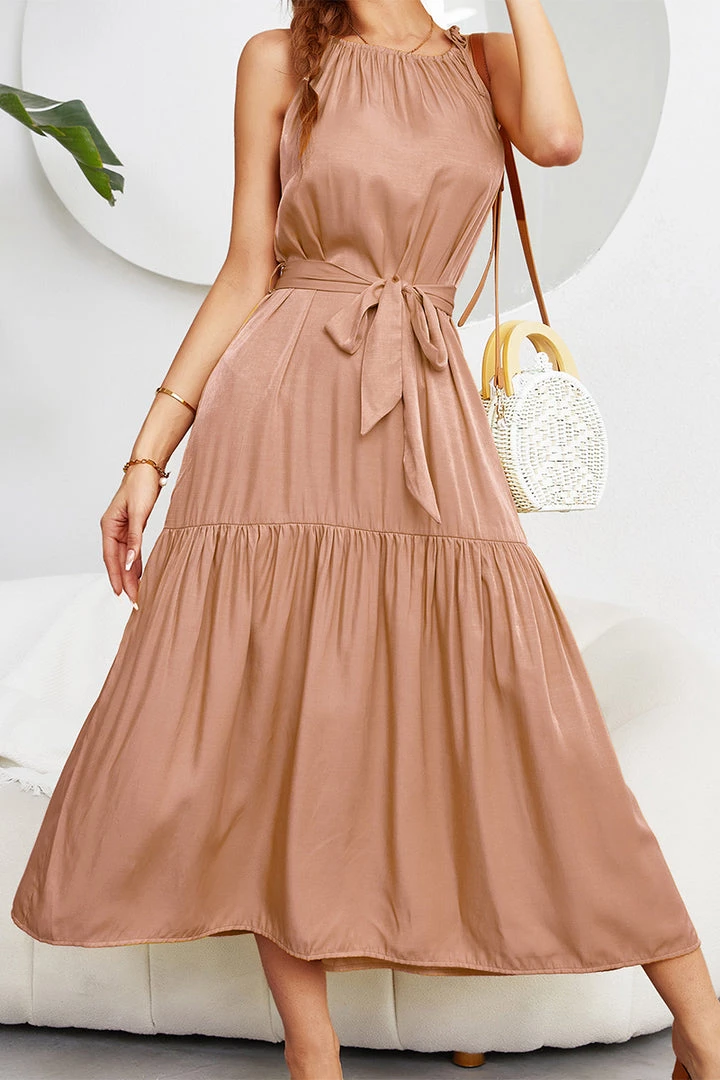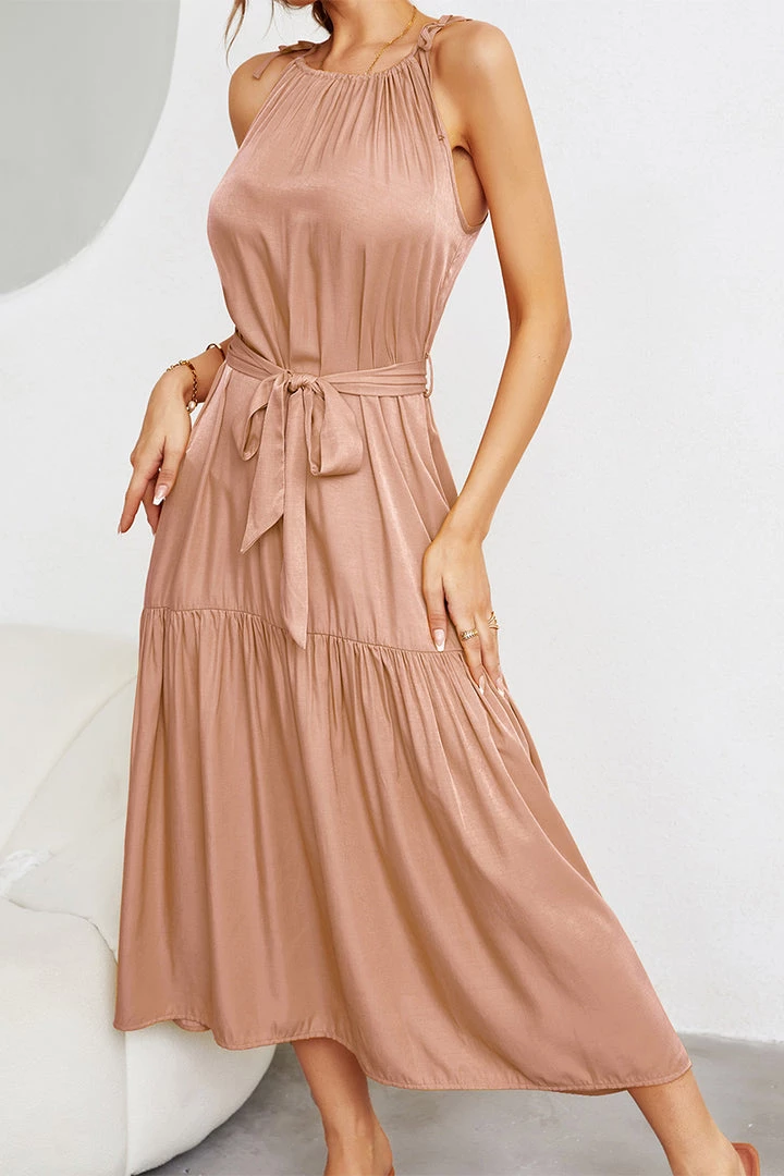 - Feature: Midi high low hemline. Halter neckline. Fabric waist tie.