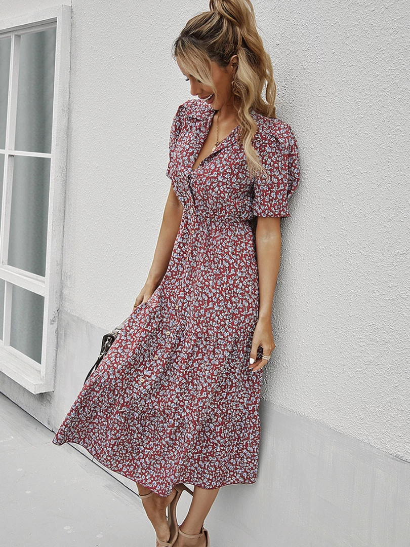 Our Claudia Dress comes in a red tone base, with a blue floral print. It features a shirt collar neckline and short sleeves for a relaxed, comfortable fit. This flowy midi pairs beautifully with our heels or sandals for a fun casual look!