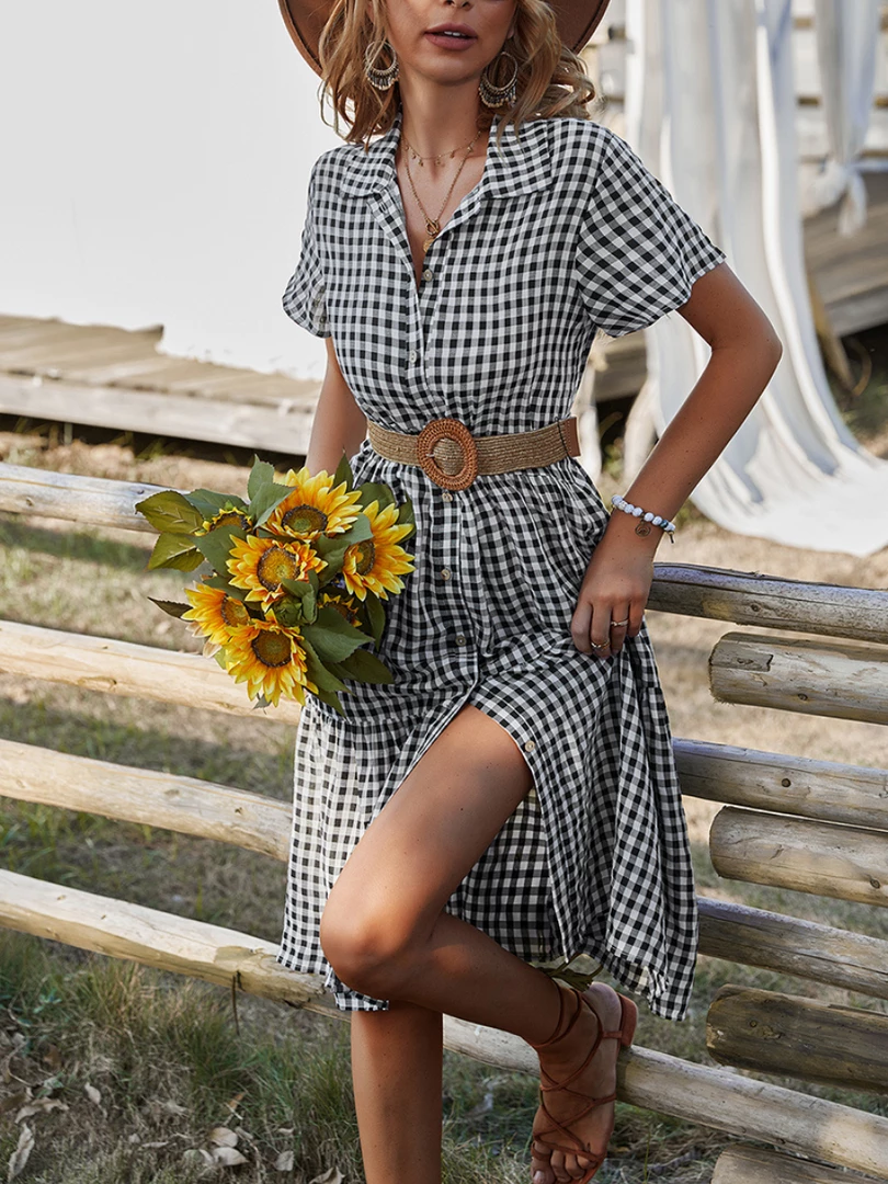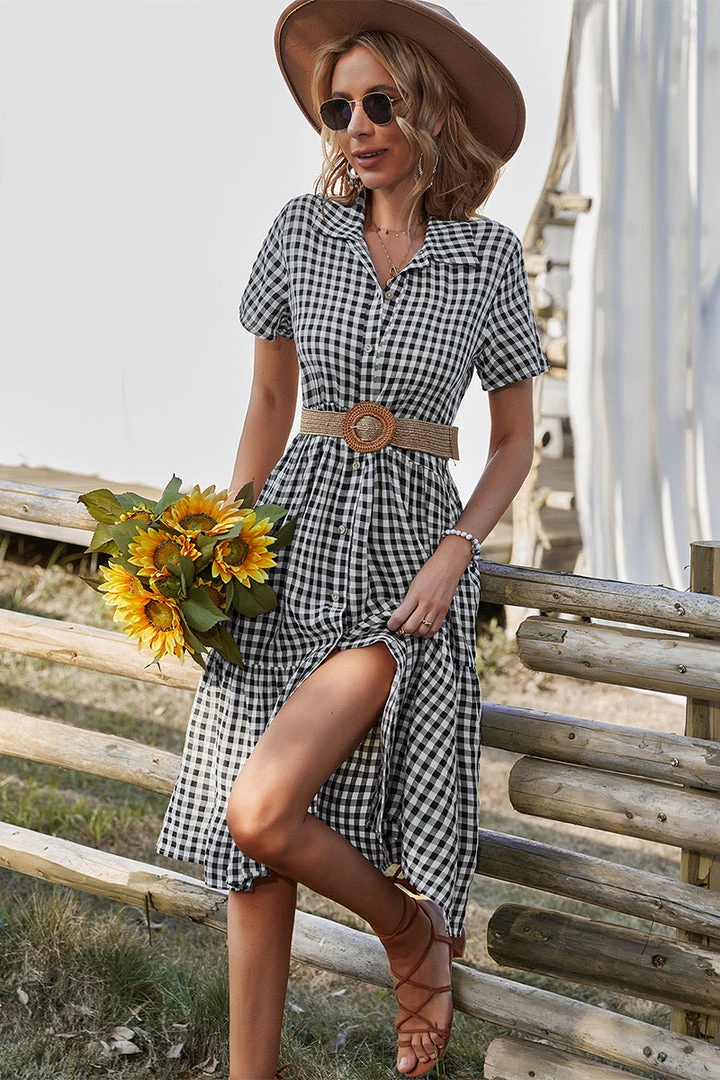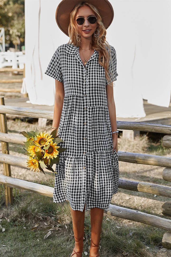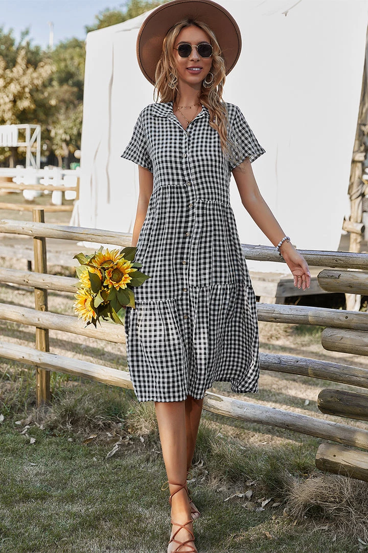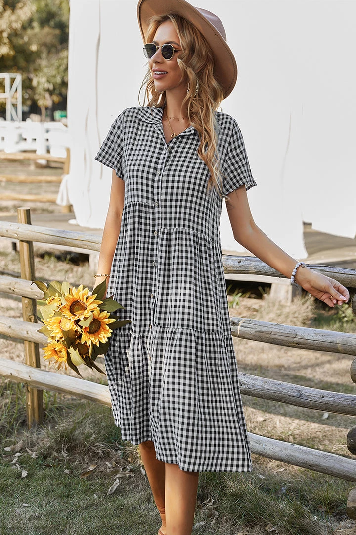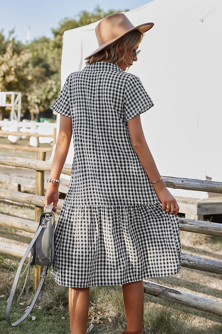Our Darleen Dress comes in a black and white checkered print. This features a shirt style, with frill details, button front, and a flowy skirt. The relaxed fit mid pairs beautifully with our heels or sandals for a fun casual look!