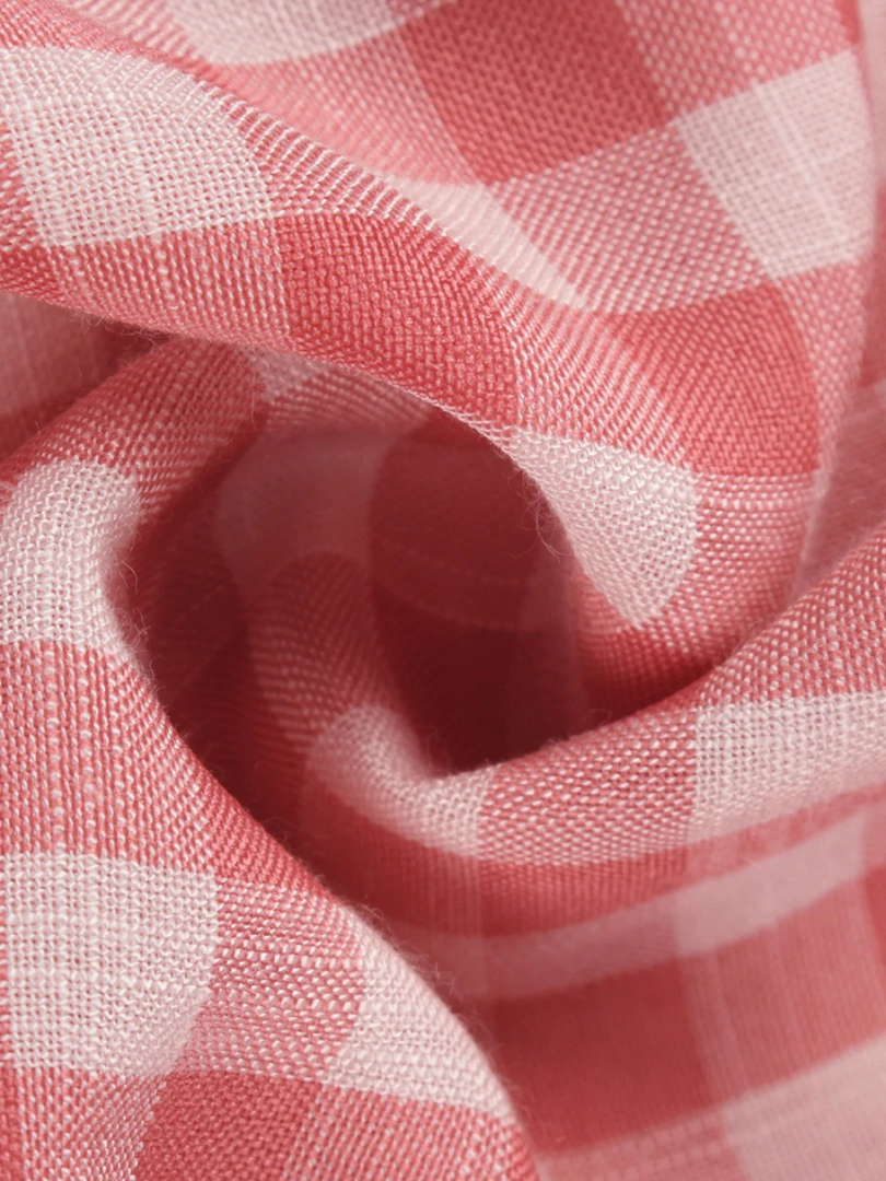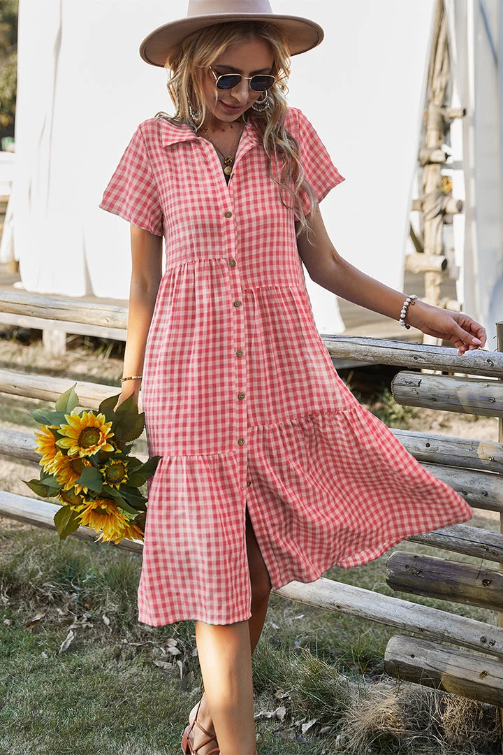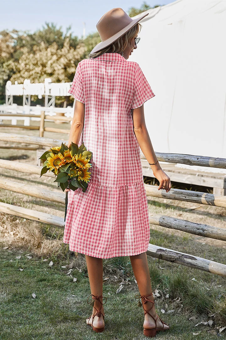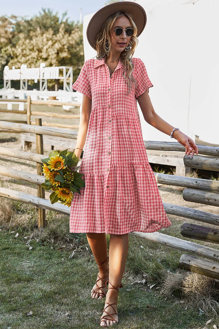 Our Darleen Dress comes in a pink and white checkered print. This features a shirt style, with frill details, button front, and a flowy skirt. The relaxed fit mid pairs beautifully with our heels or sandals for a fun casual look!