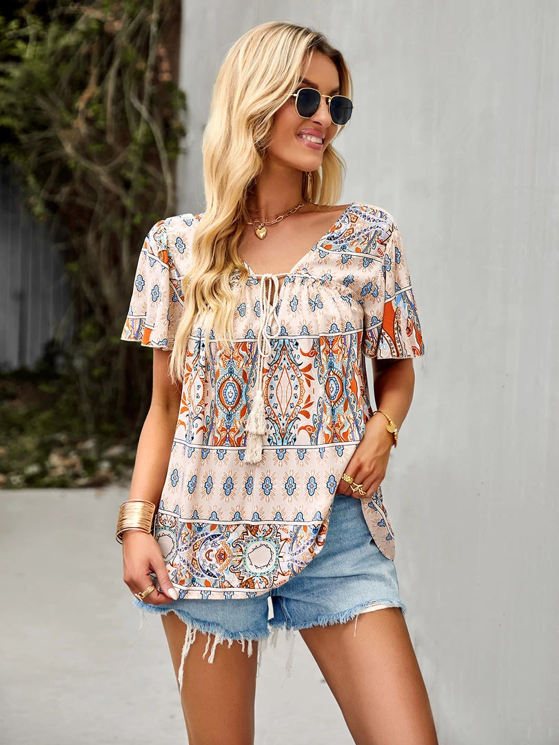 - Feature: Frill short sleeves. V neckline with tassel tie on front. Relaxed fit. Maternity friendly.