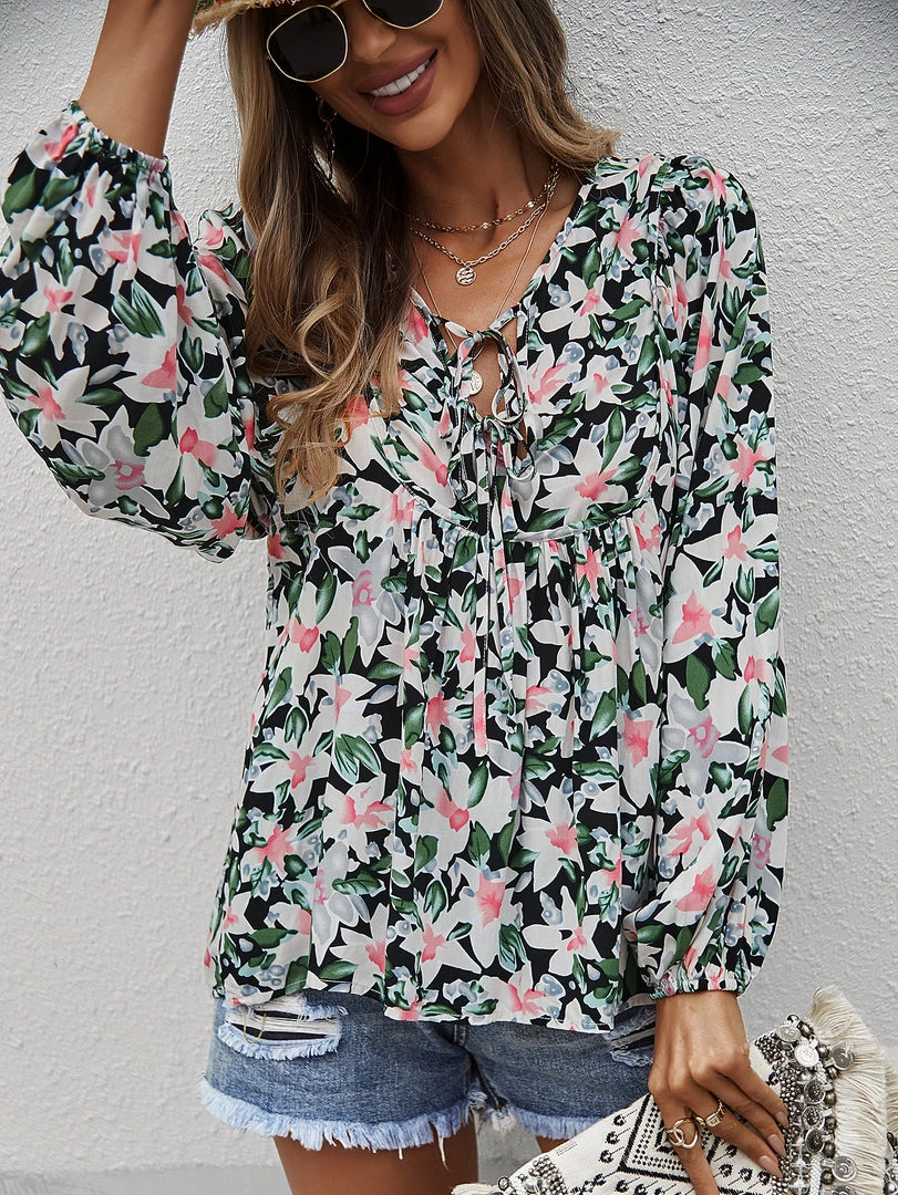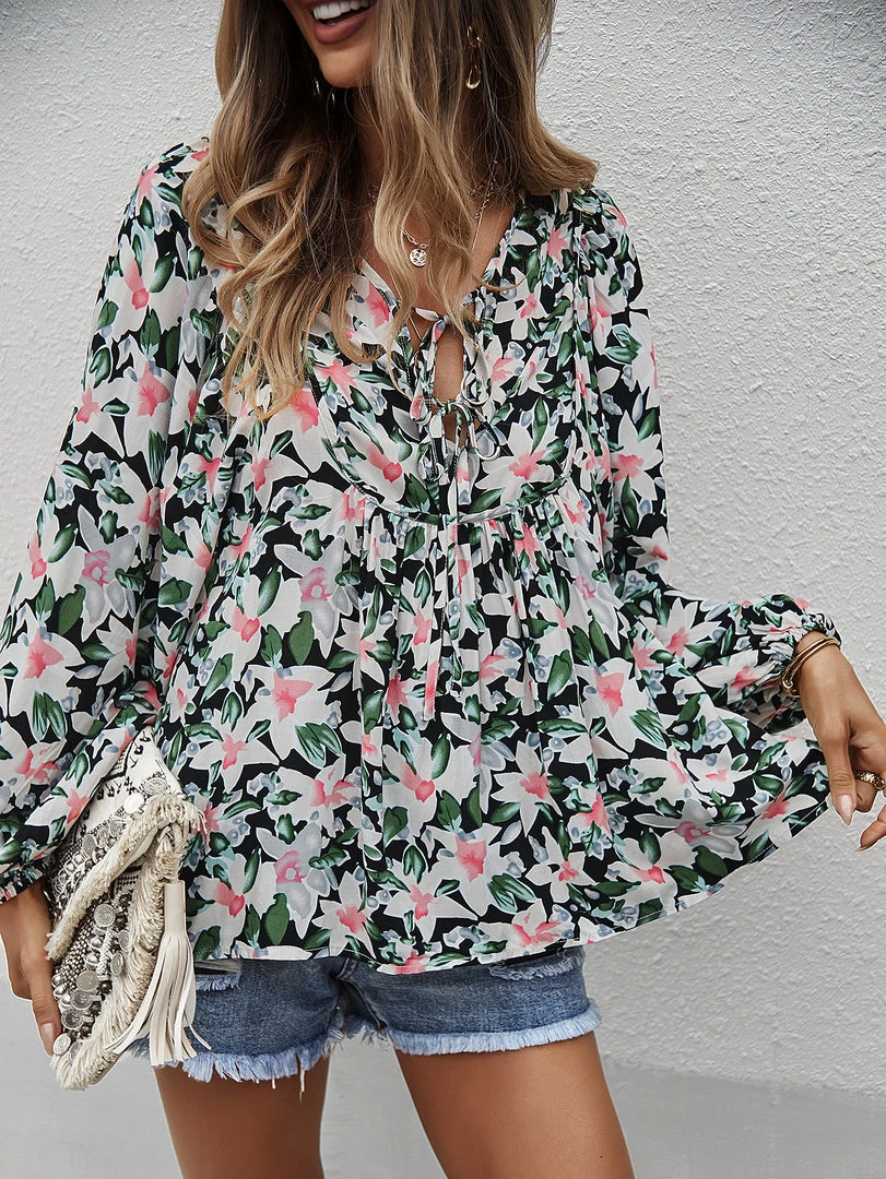 Our Dua Lipa Top comes in a beautiful black tone featuring a contrasting pink floral print in a relaxed fit. The neckline with string, cuffed sleeves and gathered detailing gives this boho piece a structured yet flowy look. Pair with our heels and sandals for an easy summer look.