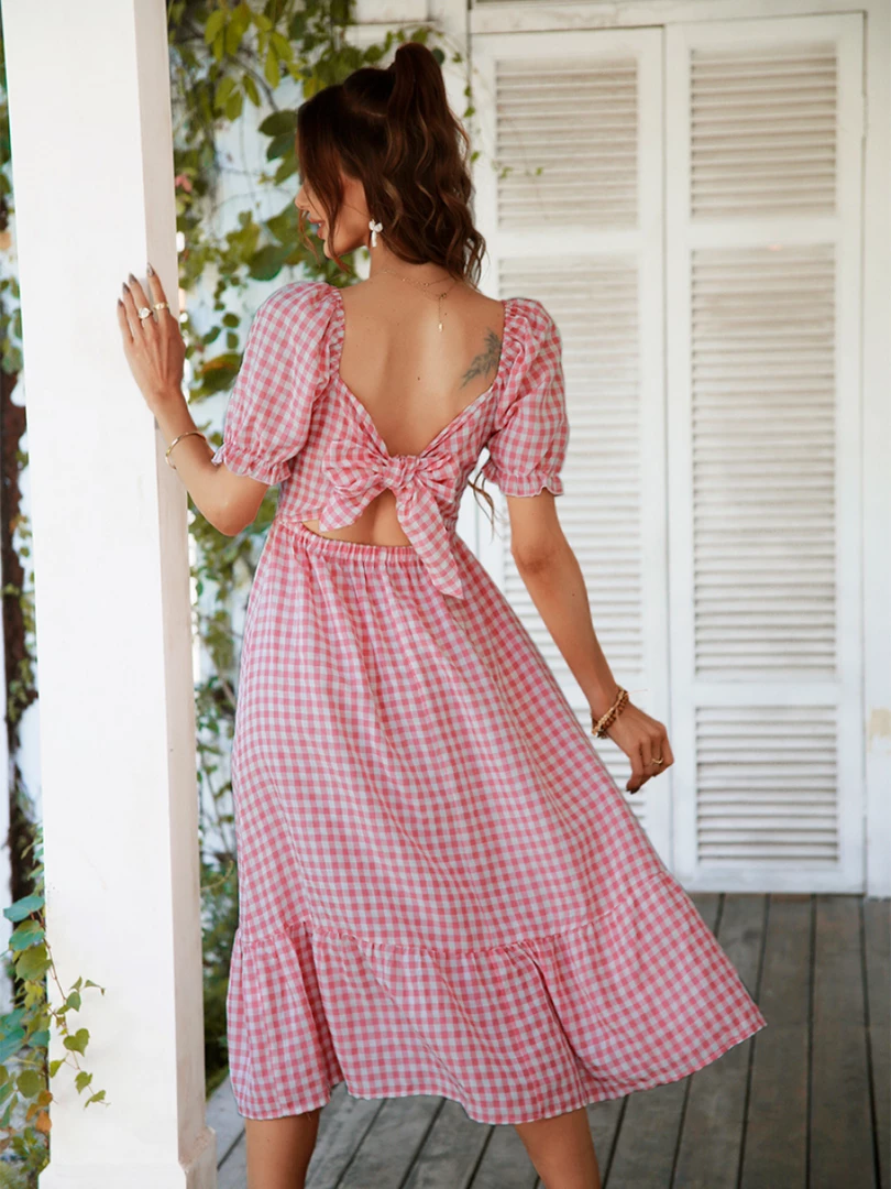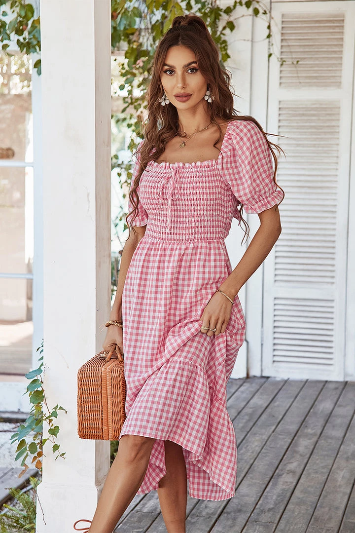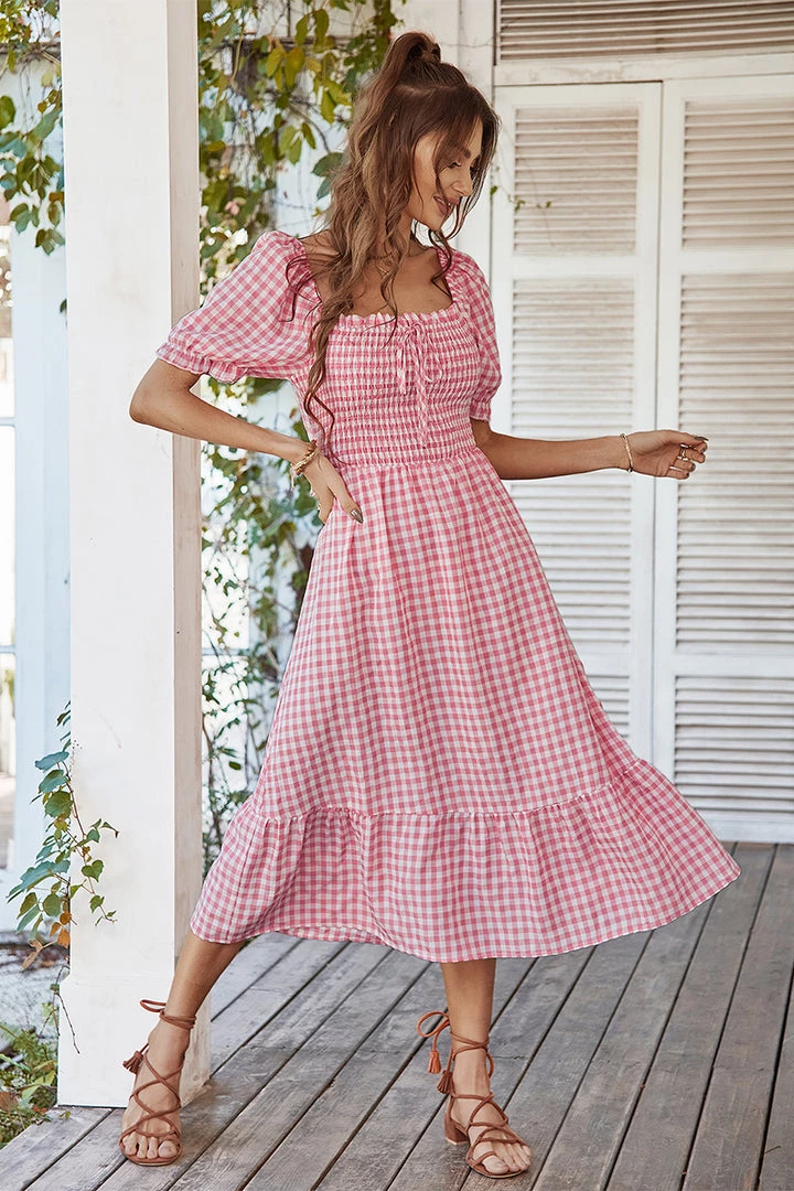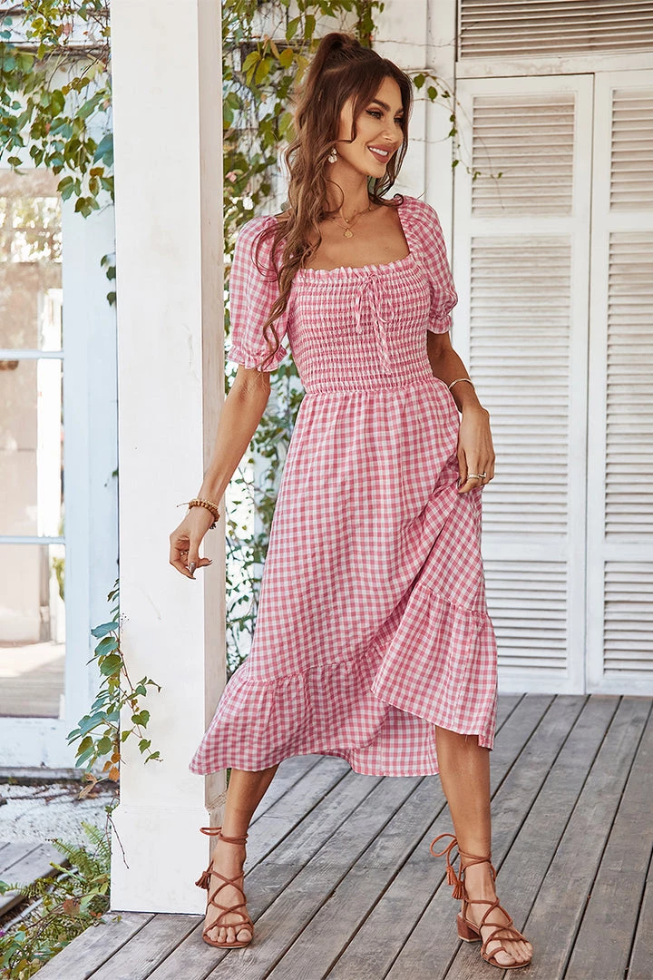 Our Eloisa Dress comes in a pink and white gingham print. This features a comfy shirred bodice, square neckline, tie bow details at the black, short sleeves cuffed at the elbows, and a tiered skirt that adds texture and uniqueness to this piece! This relaxed midi pairs beautifully with our heels or sandals for a fun casual look!