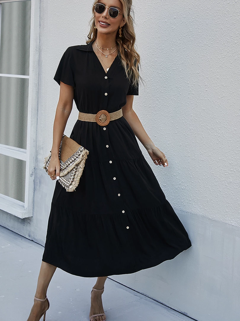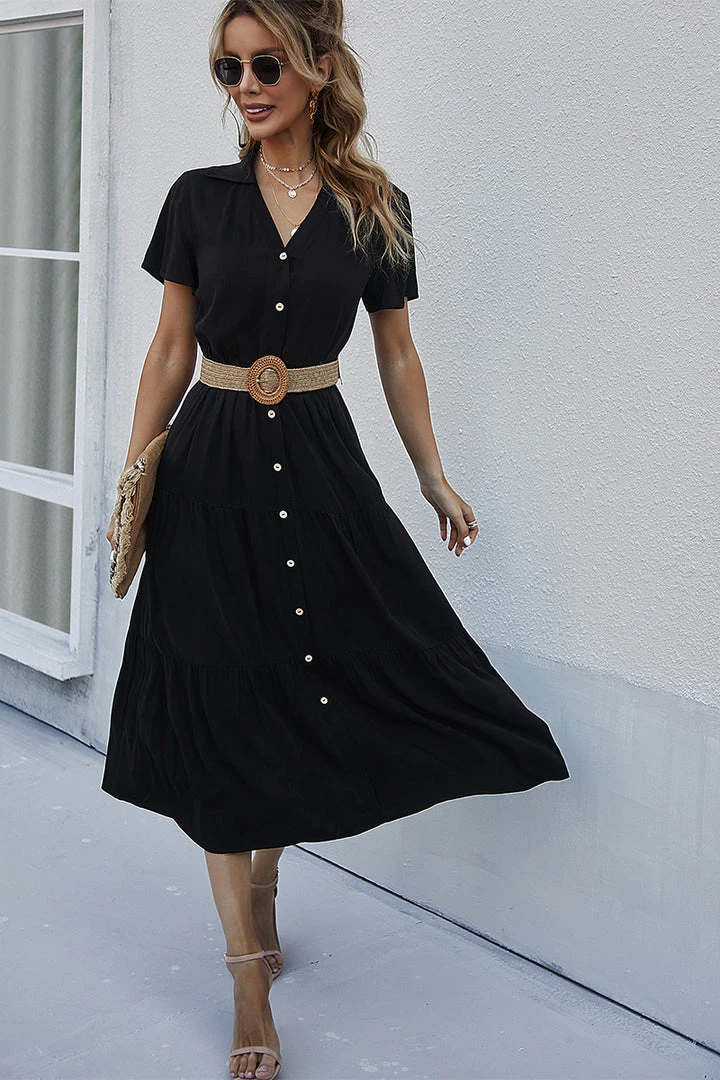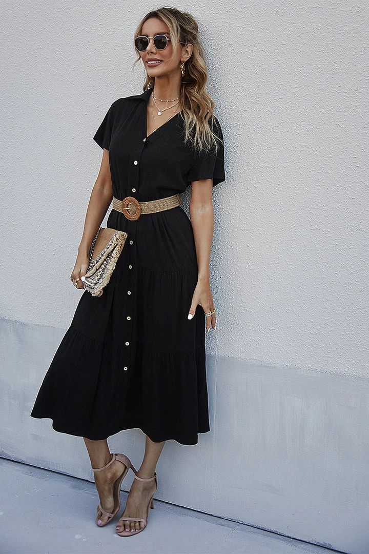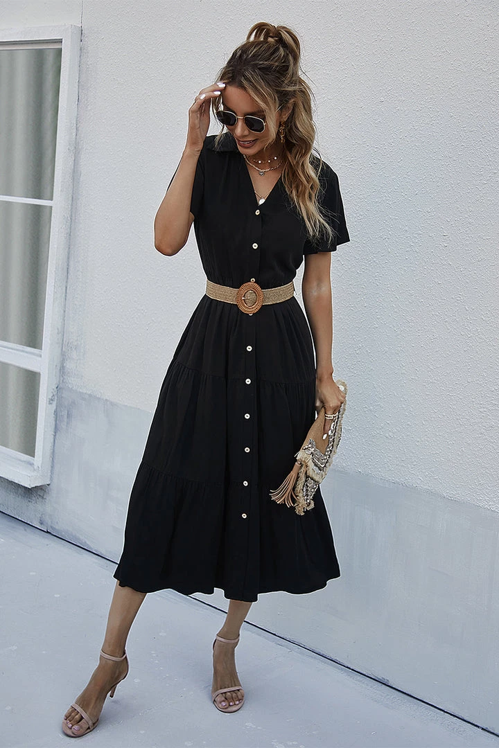 Our Emily Dress comes in a classic fresh black tone in a relaxed fit. This breezy midi features a collared V neck with functional buttons down the front, perfect for breastfeeding mums. The relaxed short sleeves and tiered skirt makes this piece such a comfortable wear.