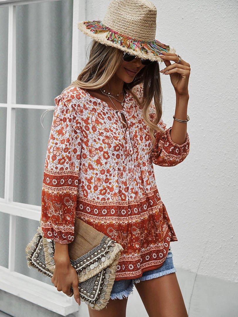 Our Glenna Top comes in a rust tone print. It features quarter sleeves and a v neckline for a relaxed, comfortable fit. This top pairs perfectly with a basic pants or shorts for a relaxed seasonal look!