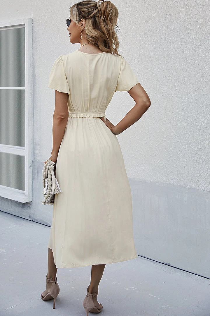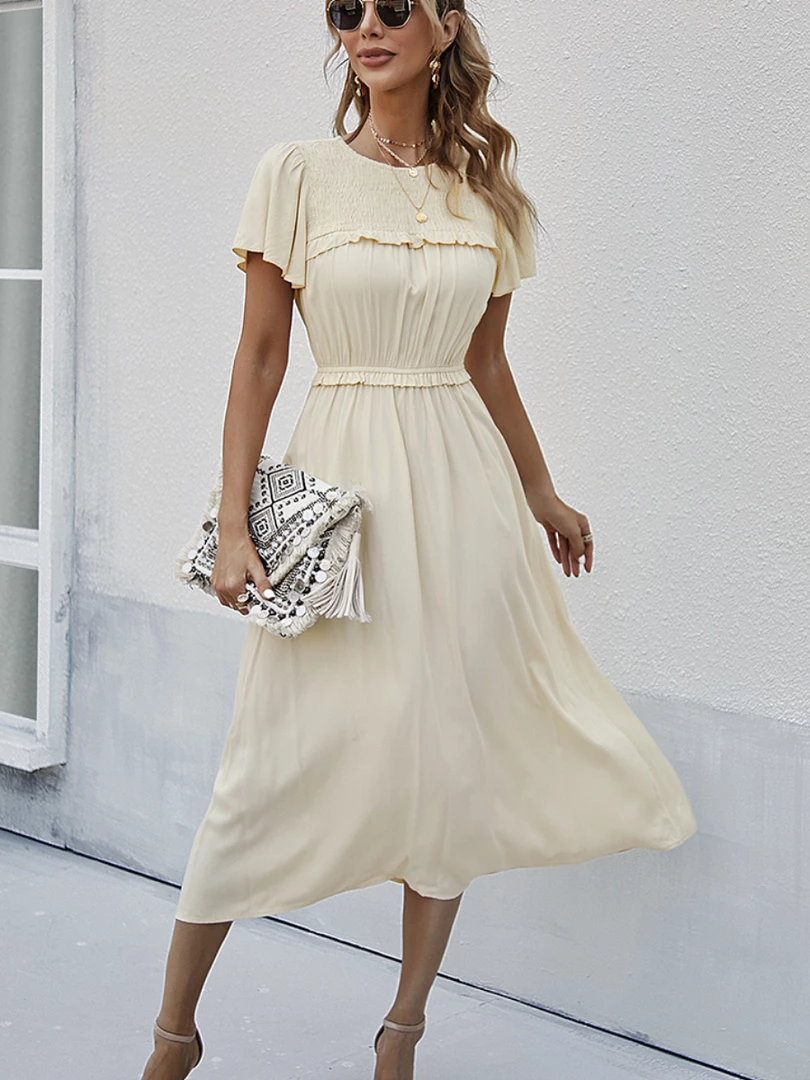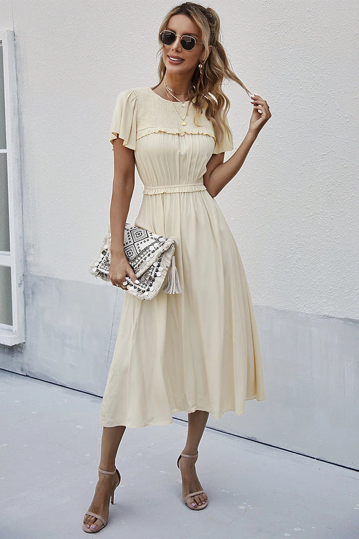 Our Iolana Dress comes in a soft beige tone. it features a round neckline, short sleeves and a textured pattern across the chest. This stunning midi pairs wonderfully with our sandals or heels for a stunning formal look!