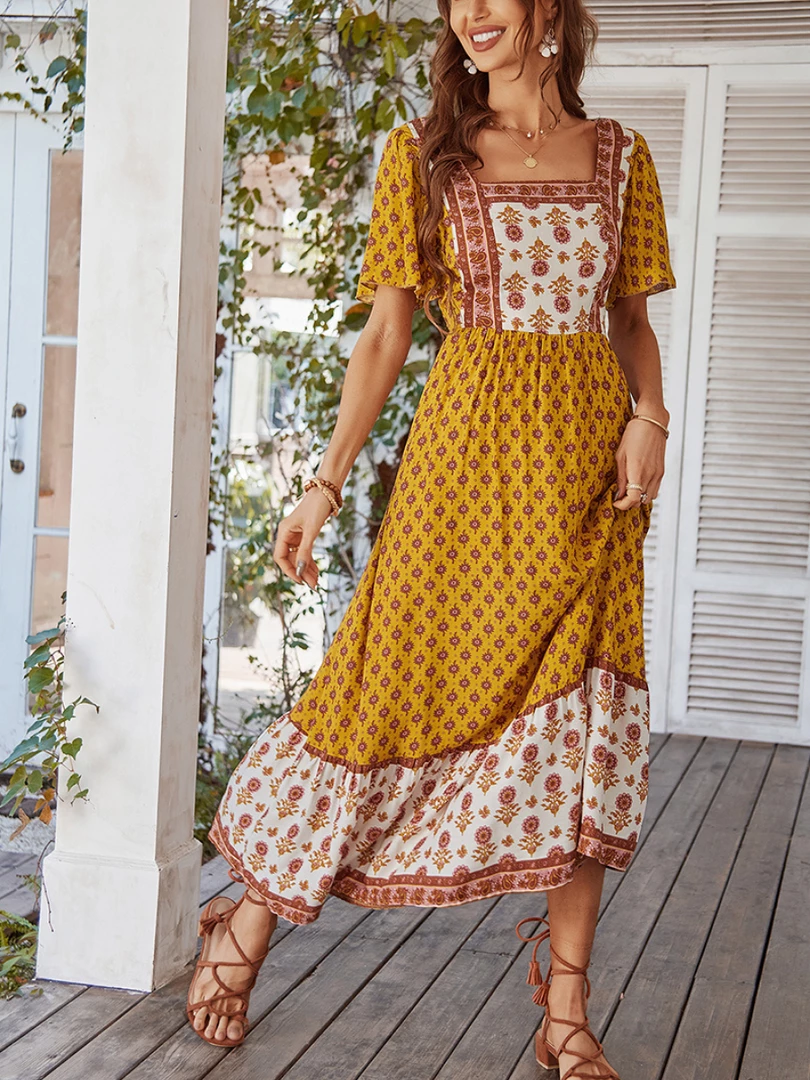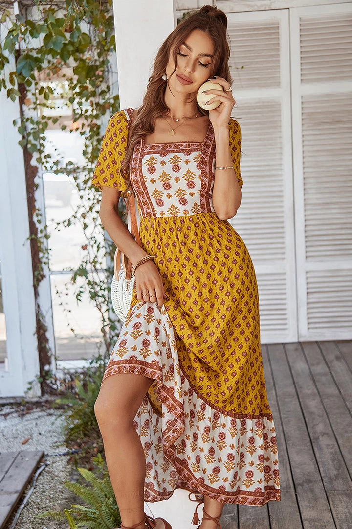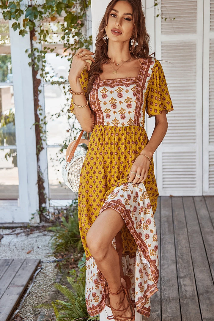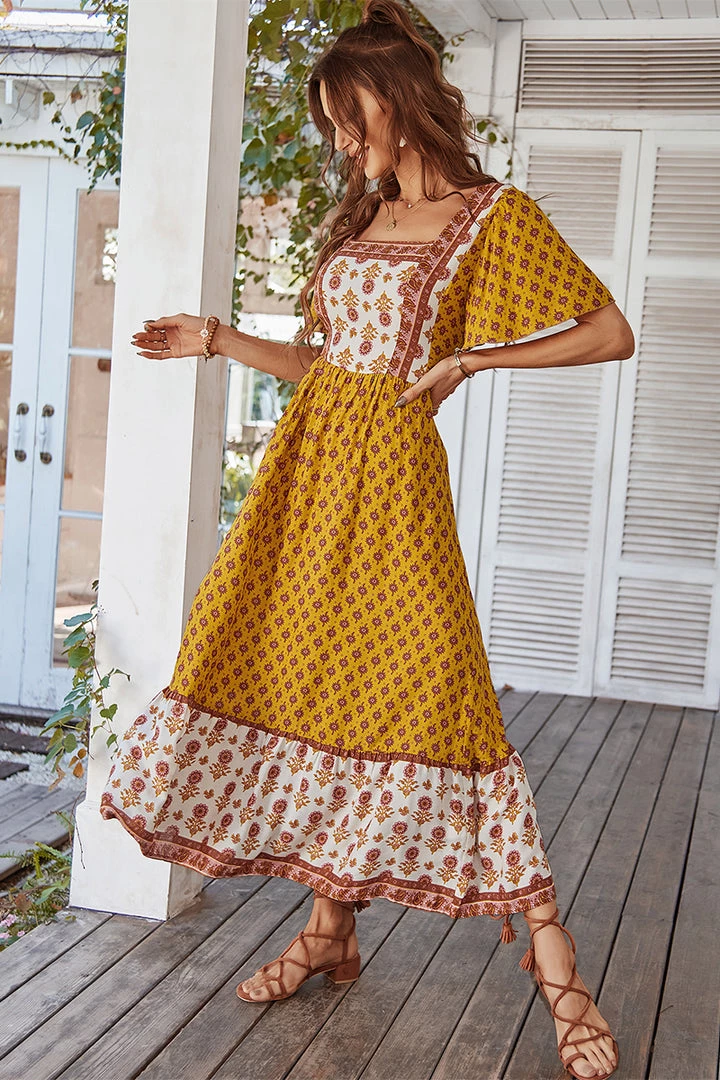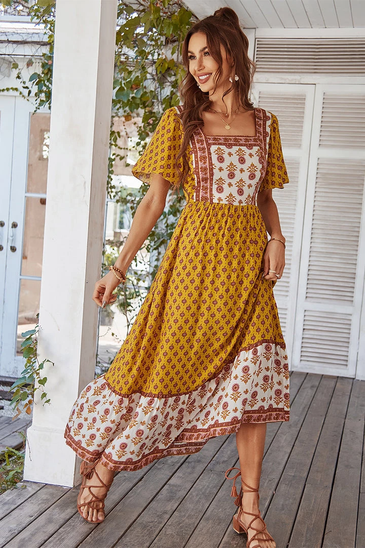 Our Isabella Maxi Dress comes in a mustard tone base, with a brown and yellow print. It features a scoop neckline, flutter cap sleeves. This flowy maxi is a boho dream! This boho maxi pairs beautifully with our heels or sandals for a fun casual look!