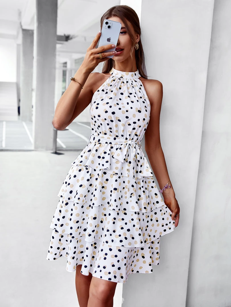 Our Keeva Dress comes in a white tone base, with a black & beige tone spot print. It’s a sleeveless midi that features a high neckline for a relaxed, comfortable fit. This flowy midi pairs beautifully with our luxe heels collection for a stunning look for the spring season!
