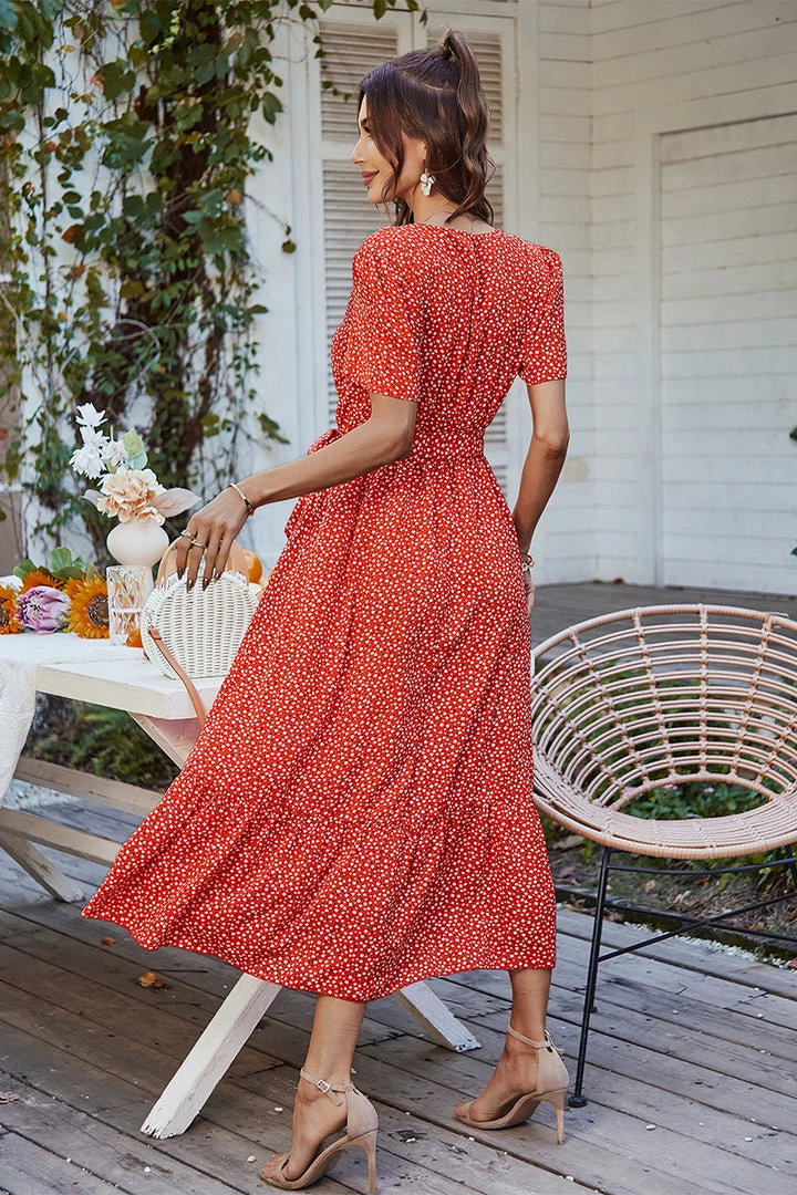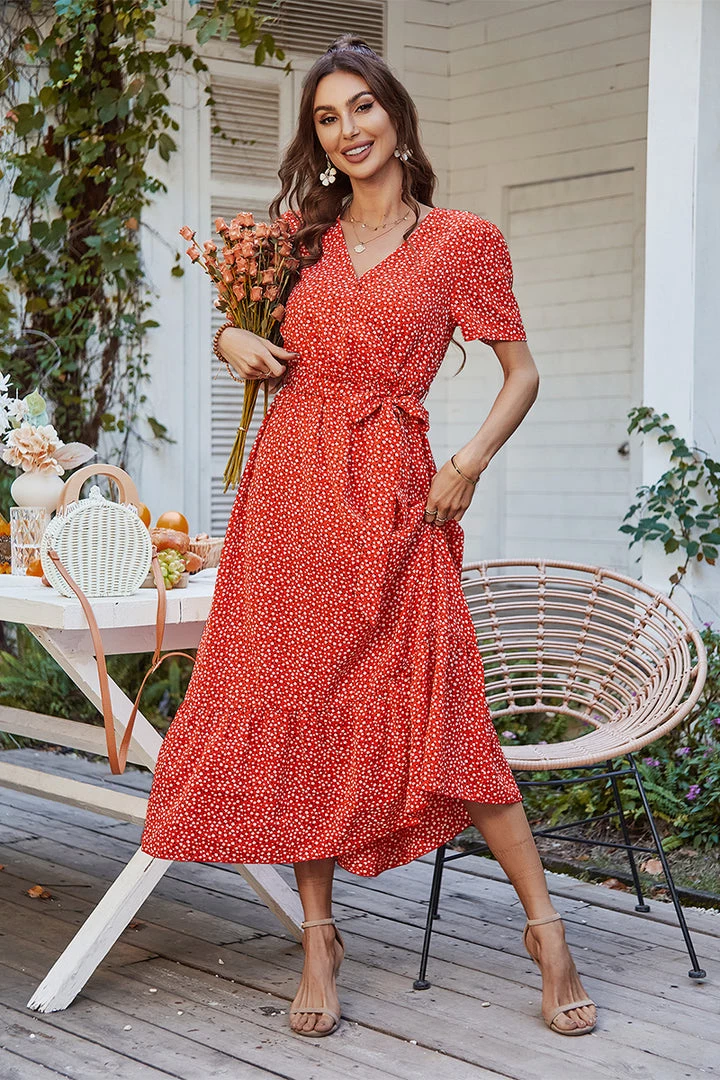 Our Leena Midi Dress is a vibrant red with white flower print. This lightweight, high low hemline dress is a relaxed, wrap fit you’re sure to love. The frill hemline short sleeves float with the body as you move. The waist can be adjusted by tightening the wrap tie as desired. Maternity friendly and perfect for a range of occasions like a picnic by the beach or brunch with the family.